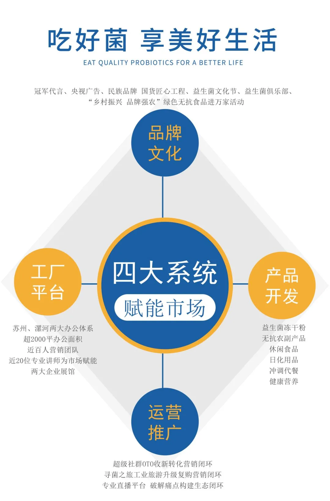 益友世家,是一家专注于益生菌、益生元及膳食纤维等领域的创新型健康科技企业。公司专注益生菌,聚焦微生态,打造高品质益生菌,做真正有益国人肠道健康、全家都吃得起的益生菌!我们有出厂检测活性高达600亿、1200亿、3000亿、6800亿、10000亿每条的高活性益生菌冻干粉,已形成以益生菌健康产品为主体,结合益生菌无抗农副产品、益生菌休闲食品、益生菌日化用品、益生菌冲调代餐产品等全系列的益生菌完整产品线!