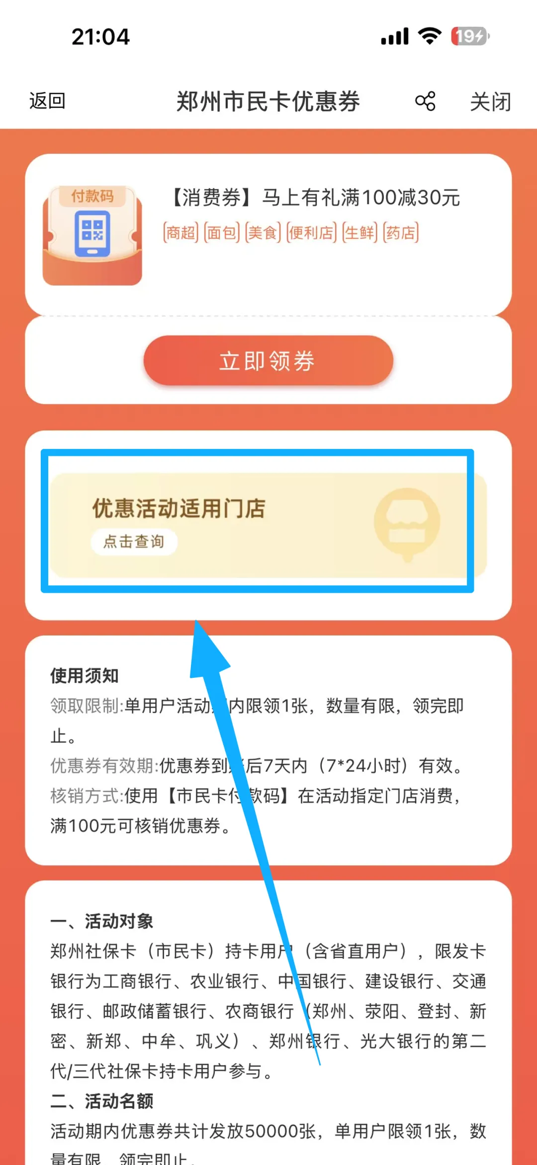 核销方式:使用【市民卡付款码】在活动指定门店消费,满100元可核销优惠券。