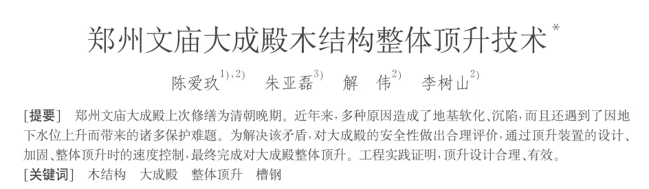 郑州文庙大成殿的整体抬升是国内首次对较大体量的古建筑单体不落瓦的整体抬升施工。整体顶升方法适用于梁柱榫卯结合、保存现状不是很好、外墙承载能力较小的古建筑物。这不仅大大降低了施工成本,也完好的保留了古建筑原有的基础;屋面由于不卸瓦顶,最大程度地保留了原有建筑的历史信息;使用丝杆式的整体抬升也避免了传统的逐缝抬升梁架的抬升工艺对木构件榫头造成的损坏。是我国古建筑整体抬升的一个成功案例。