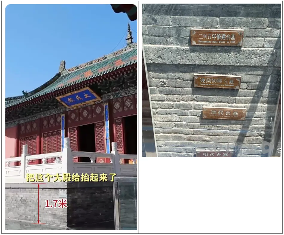 顶升后柱的基础采用条形基础,大殿内部柱采用砖砌大放脚的独立大放脚基础,同时对屋内地面进行回填、夯实。最后恢复围墙,顶升完成后的大成殿如图6所示。