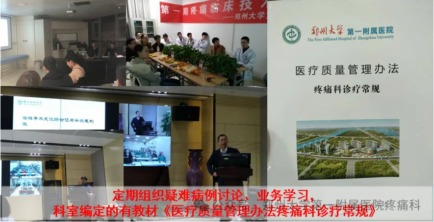 郑州大学第一附属医院疼痛科始建于1992年,是全国较早开设疼痛门诊的医疗机构之一。科室于2011 年设立疼痛科病房,2016年、2021年先后拓展郑东院区、南院区疼痛科病房。经过多年发展,现已成为集医疗、科研、教学于一体的现代化疼痛诊疗中心。是"河南省临床重点专科"、"河南省医学重点学科"、"国家县域医疗卫生机构癌痛全程管理精准能力提升项目示教单位","老年神经病理性疼痛诊疗示范基地联合建设单位","中国康复医学会疼痛康复专科培训基地","难治性疼痛规范化诊疗示范基地","郑州大学第一附属医院神经病理性疼痛专病联盟牵头单位",“河南省微循环学会疼痛康复超声介入技术培训基地”。