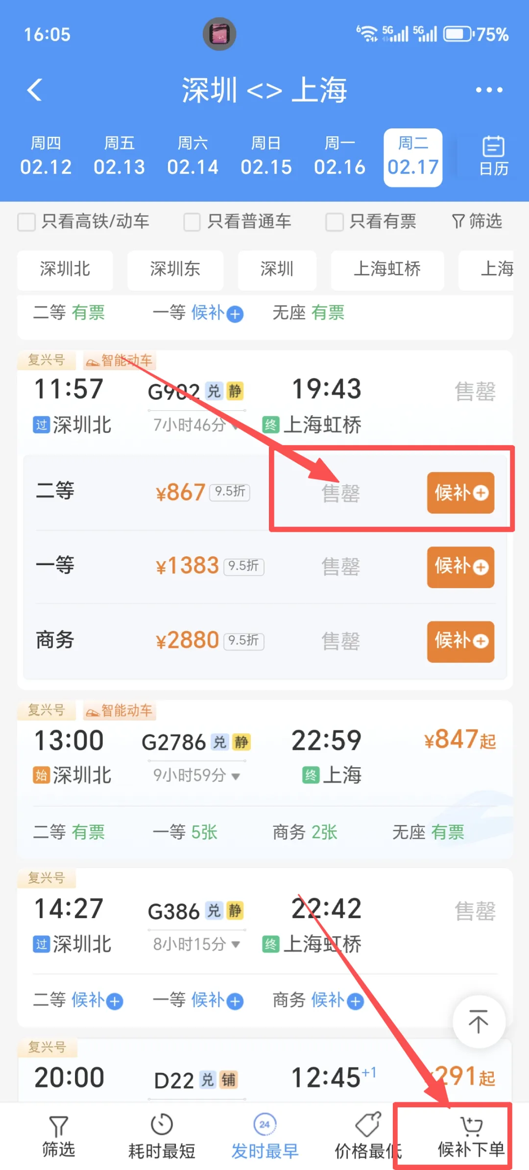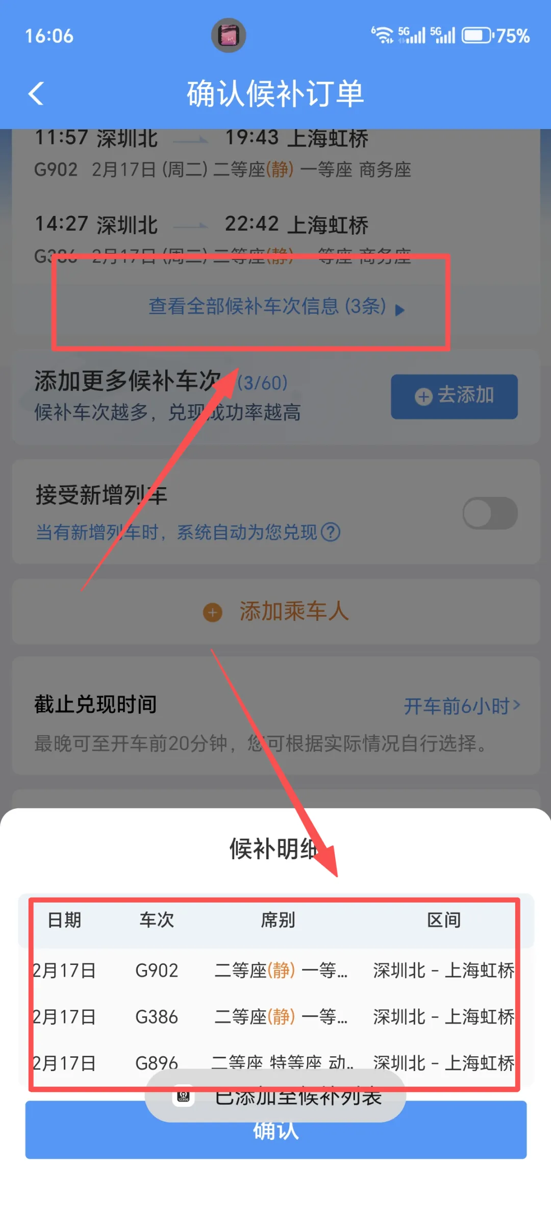 添加更多候补车次后,在确认候补订单页面的最上方,可以查看全部候补车次信息,包括日期、车次、席别、区间。