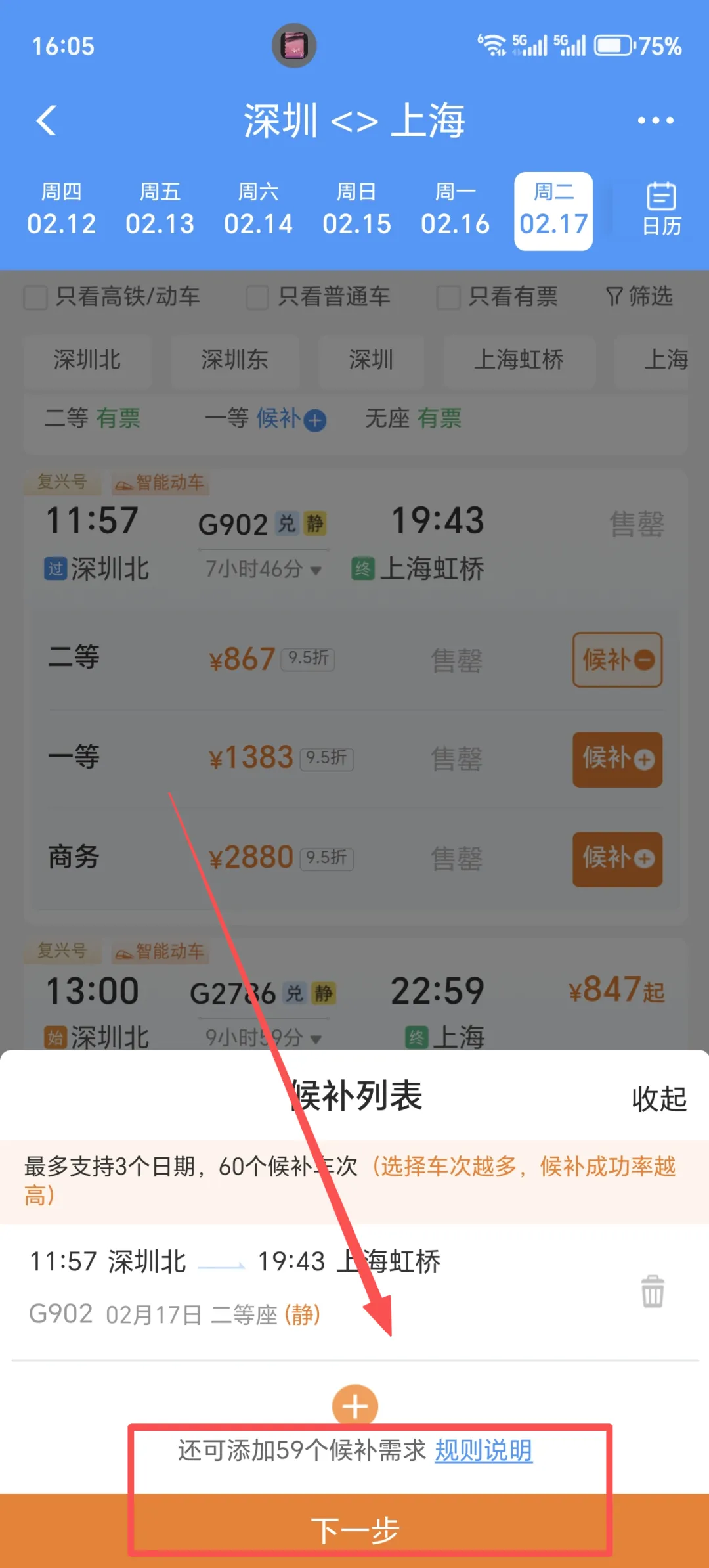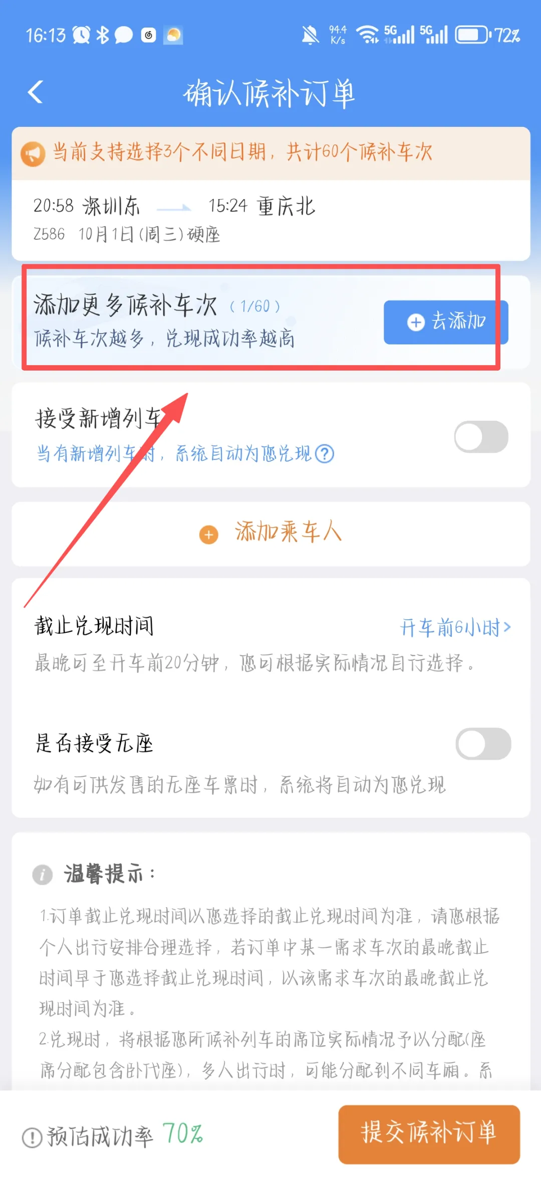 提交候补时,尽量增加一些候补车次与日期,每个订单可选择3个乘车日期、最多60个候补车次,选择的候补车次越多,成功率越高;