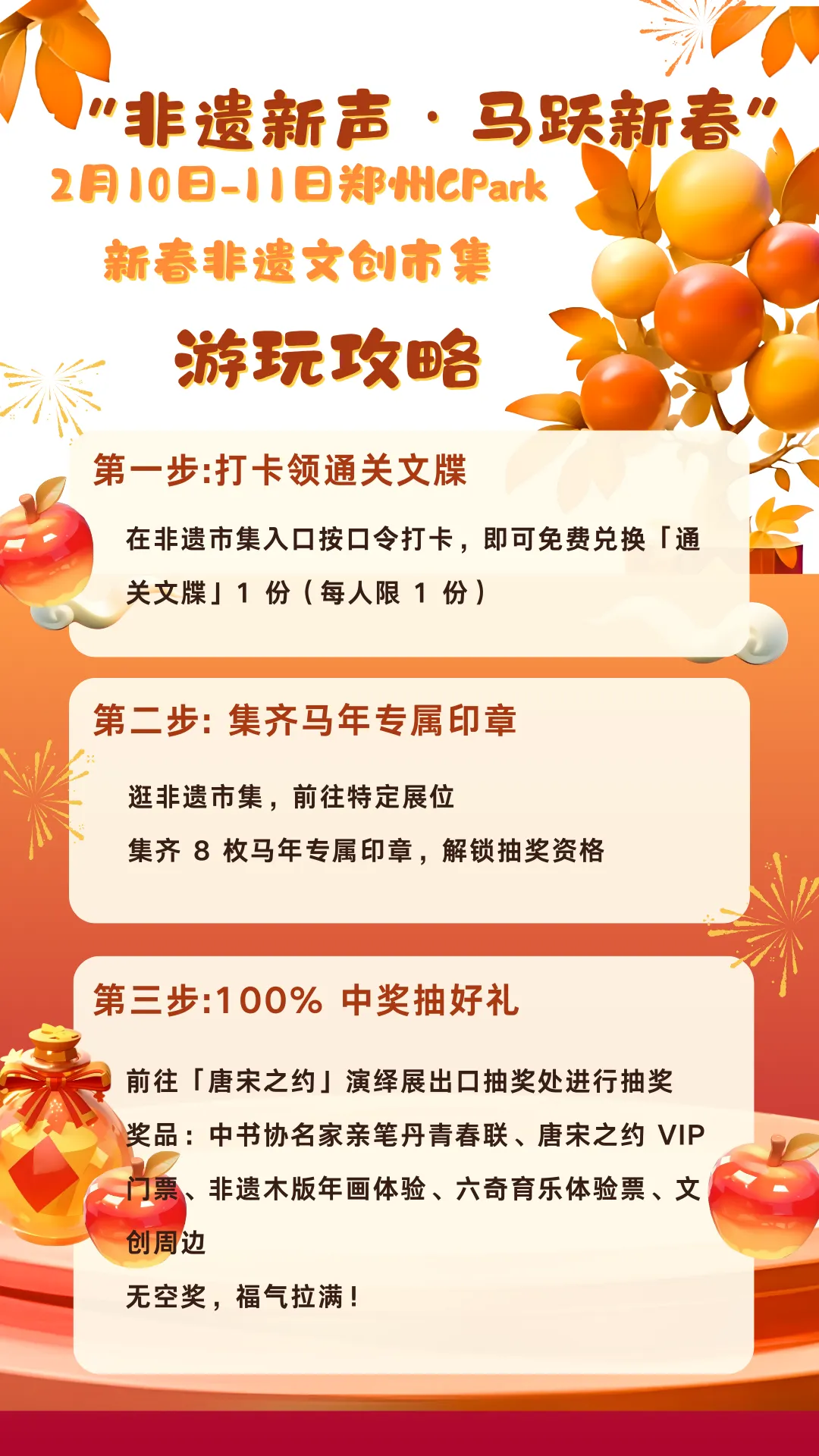 这个小年及新春前夕,带上家人、约上好友,来郑州 CPark!逛非遗市集、看沉浸演绎、赏才艺比拼、玩亲子游乐、品特色美食,在欢声笑语中感受非遗魅力,收获满满福气,共赴一场兼具文化感与烟火气的新春之约!