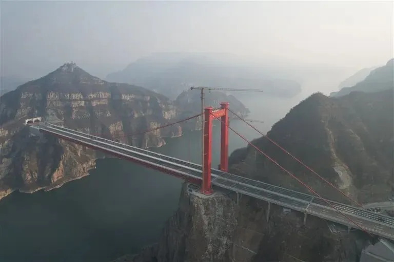 世界首座独塔地锚式回转缆悬索桥——济新高速黄河三峡大桥。记者 王铮 摄