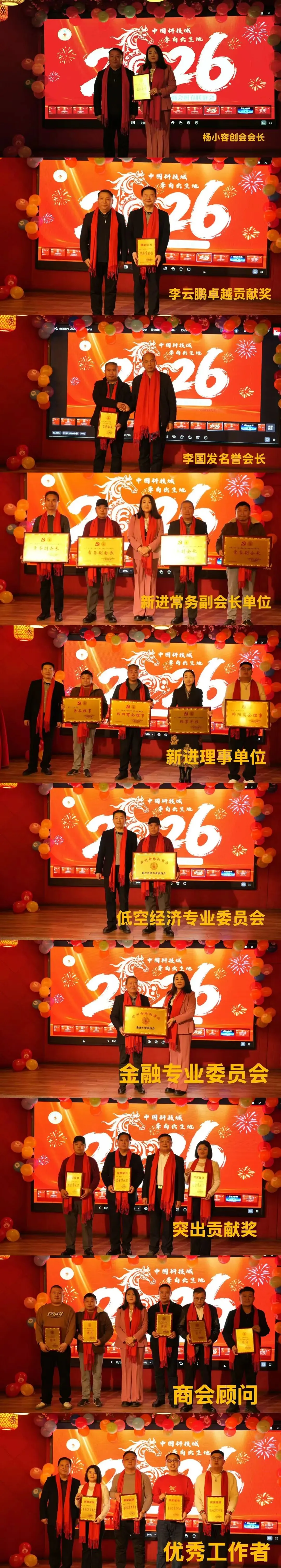 大会举行了庄重而热烈的表彰与授牌仪式。在激昂的《团结友谊进行曲》中,与会领导先后为创会会长、名誉会长、商会顾问,以及获得“卓越贡献奖”、“突出贡献奖”、“优秀工作者”的个人和集体颁授荣誉牌匾,表彰他们为商会发展做出的突出贡献。同时,大会为新晋常务副会长、常务理事颁发了任职牌,并正式为“低空经济专业委员会”和“金融专业委员会”授牌,标志着商会在专业化、精细化服务方面迈出新步伐。