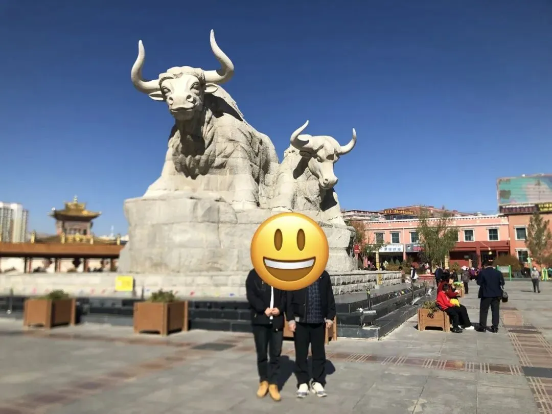 图为与小时候的邻居,在天祝县城华藏寺的白牦牛广场前合影。
