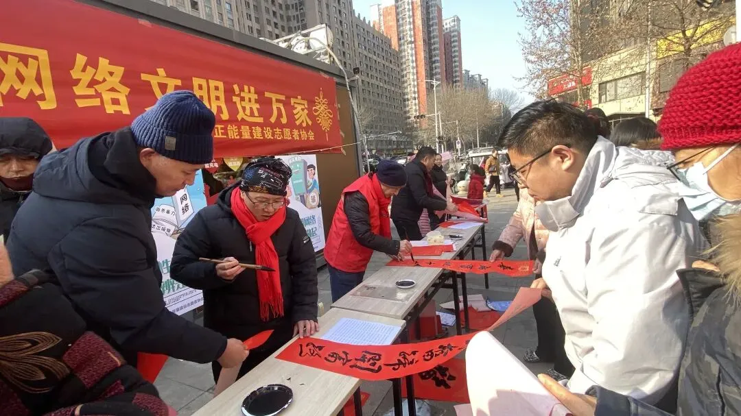 本次活动邀请到中国书法家协会会员耿歧超、河南省书法家协会会员路思利、杨柳青、赵炳杰及其他书法爱好者进行现场写春联送祝福,将“文明上网”“网络安全”“防诈反诈”“拒谣传正”等理念融入联语中,既保留了春联传统的喜庆寓意,又传递了新时代网络文明价值导向。