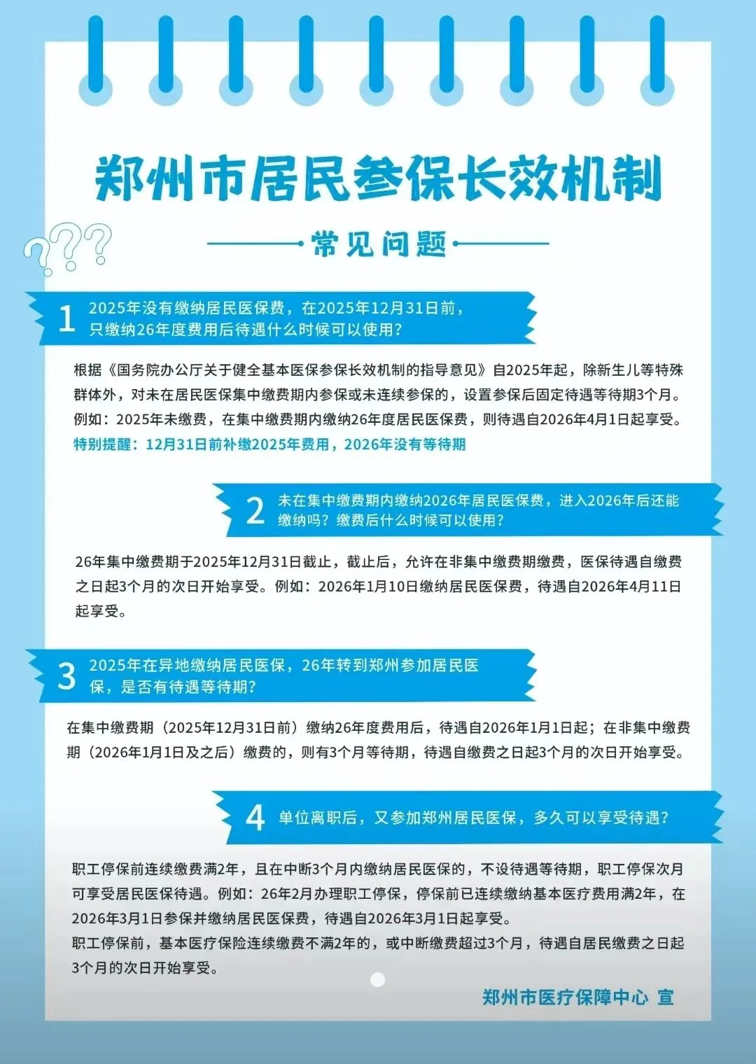 新年起,郑州市居民医保参保政策有重要调整。未在集中缴费期内参保或连续缴费中断的居民,将面临3个月待遇等待期。