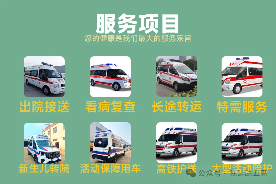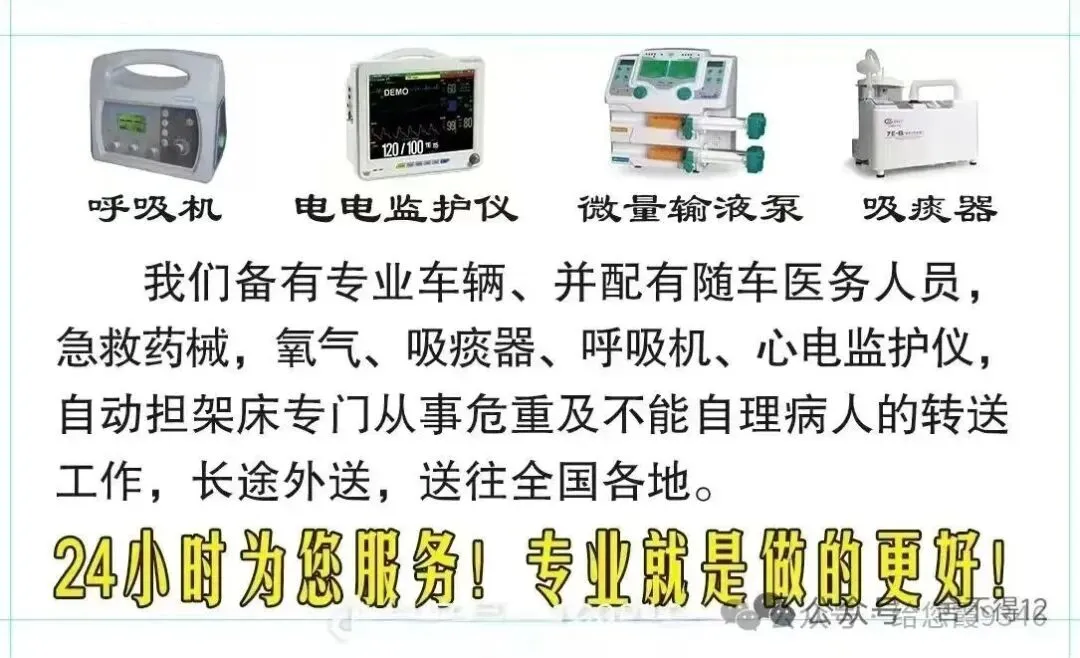 专业救护车出租转运,以核心优势守护生命通道专业救护车出租转运,作为公立医疗急救的重要补充,凭借四大核心服务优势,打破转运壁垒、降低转运风险,为各类患者提供安全、高效、贴心的医疗转运服务,成为生命健康保障的重要支撑,精准适配各类转运场景需求。不同于传统转运局限,可灵活应对跨市跨省重症转院、术后康复返乡、偏远地区急诊转诊、活动现场医疗保障等各类场景,根据患者病情、转运距离,量身定制专属转运方案,打破地域与时间限制,实现“按需调度、精准对接”。车内标配呼吸机、除颤仪、心电监护仪等全套急救设备,一应俱全且定期检修;随行医护人员均具备多年急救经验,熟练处理转运途中各类突发病情,全程监测患者生命体征、贴身护理,最大限度规避转运风险。实行24小时全天候待命4009962227,接到转运需求后,快速调度就近救护车,智能规划最优路线、避开拥堵路段,争分夺秒抢占救治黄金时间,从接单到交接,全程高效衔接、不浪费一分一秒。全程遵循标准化医疗转运流程,从患者接送、途中护理到目的地交接,每一个环节严谨细致、公开透明;同时提供贴心配套服务,耐心解答家属疑问,全程守护患者与家属的安心与放心,用专业与责任护航每一段转运之旅。