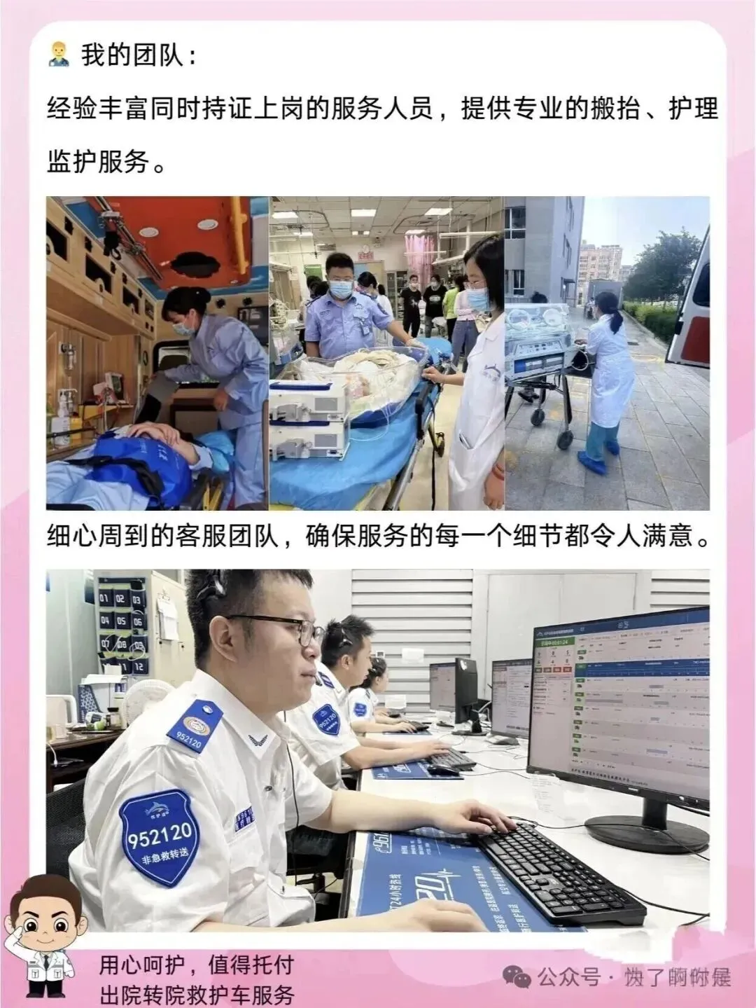 我们是120救护车出租转运服务咨询公司,我们的团队是全网最专业的医疗团队,我们的价格也是全网最优惠的价格。我们的主要业务就是,长途跨省,出院转院,120接送病人,救护车护送服务,飞机高铁转运病人。如果您现在需要用救护车,可以直接找我们客服进行预约。