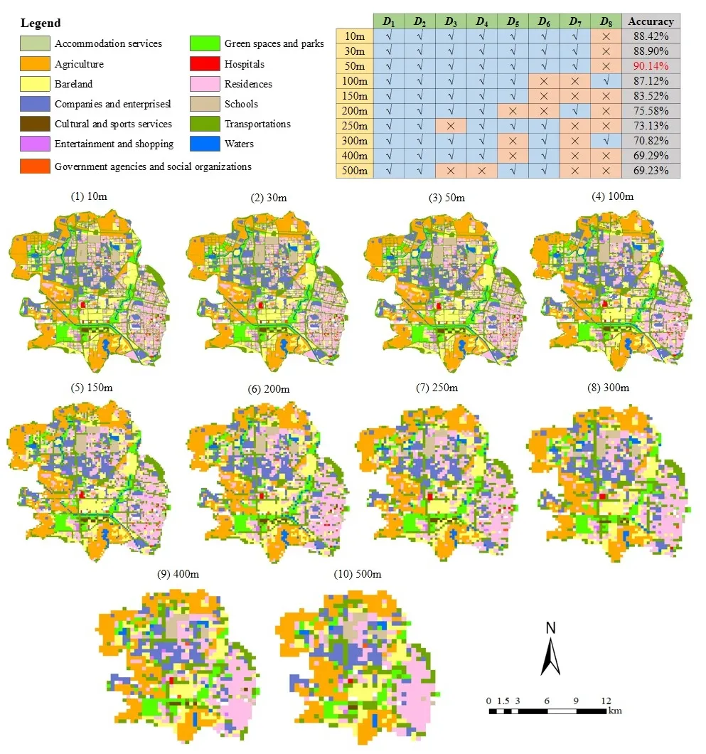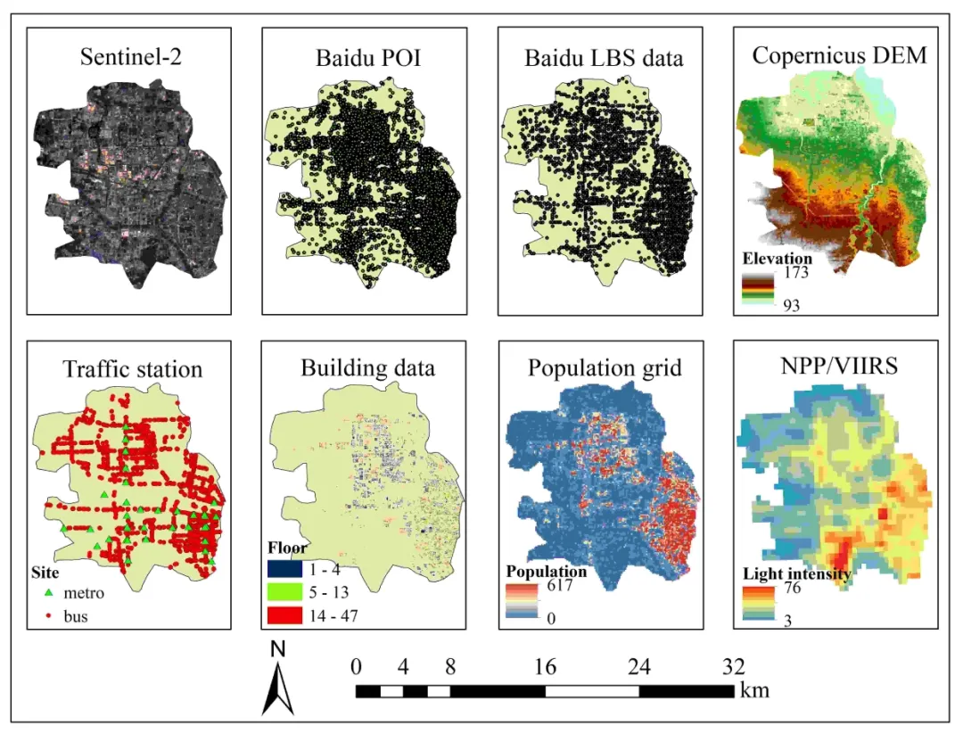 数据准备与方案生成: 收集了8类多源数据,包括Sentinel-2高分辨率影像(D1)、百度POI(D2)、百度LBS(D3)、Copernicus DEM(D4)、公交地铁站点(D5)、建筑数据(D6)、人口格网(D7)和NPP/VIIRS夜间灯光(D8)。将D1和D2设为基础数据集,通过遍历组合生成包含至少一个基础集的190种数据组合方案(CDS),预设了10个网格尺度(10米至500米),利用Global Moran‘s I指数验证了预设尺度的合理性,形成了网格尺度集合(CGS)。最终将数据组合与网格尺度结合,产生了1900种“数据-尺度”组合方案(CDSCS)。