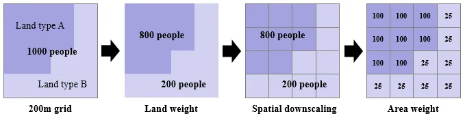 空间降尺度: 为解决200米人口格网与高精度洪水模拟不匹配的问题,提出了一种基于土地类型和面积双重约束的空间降尺度方法。首先,根据各网格定位点数量,采用头尾分割法进行迭代区域划分。然后,统计各分区内不同土地类型的面积比例,得到土地类型权重;同时统计网格内各土地类型的面积比例,得到面积权重。结合两者计算每个网格内各地类的综合权重,最终将200米网格的人口分配至50米网格,生成高时空分辨率的人口分布图。