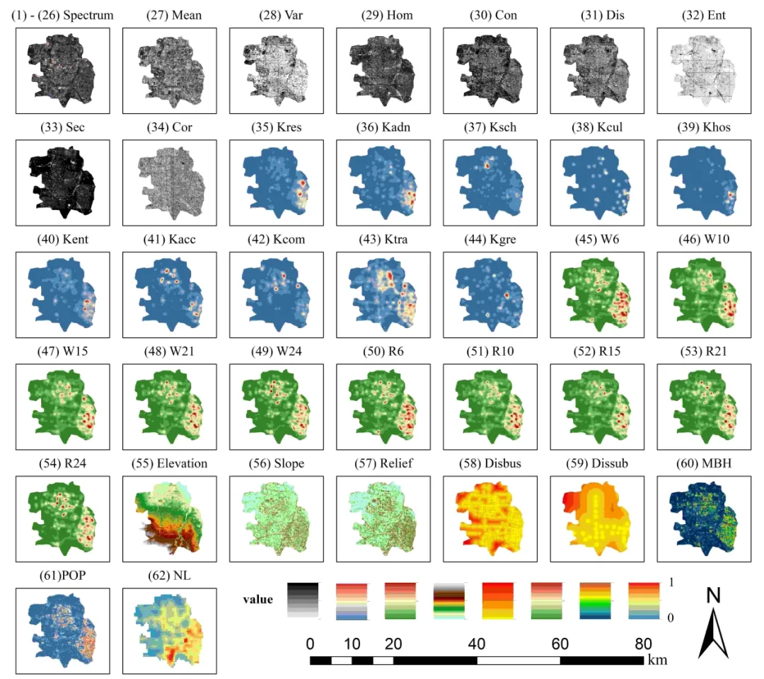 特征提取: 采用最近邻法将所有数据重采样至目标网格尺度。针对不同类型数据提取特征,如HRI的光谱统计特征(均值、标准差)、POI和LBS的核密度估计(KDE)值、DEM的高程、坡度、起伏度,以及站点距离、平均建筑高度等其他特征。