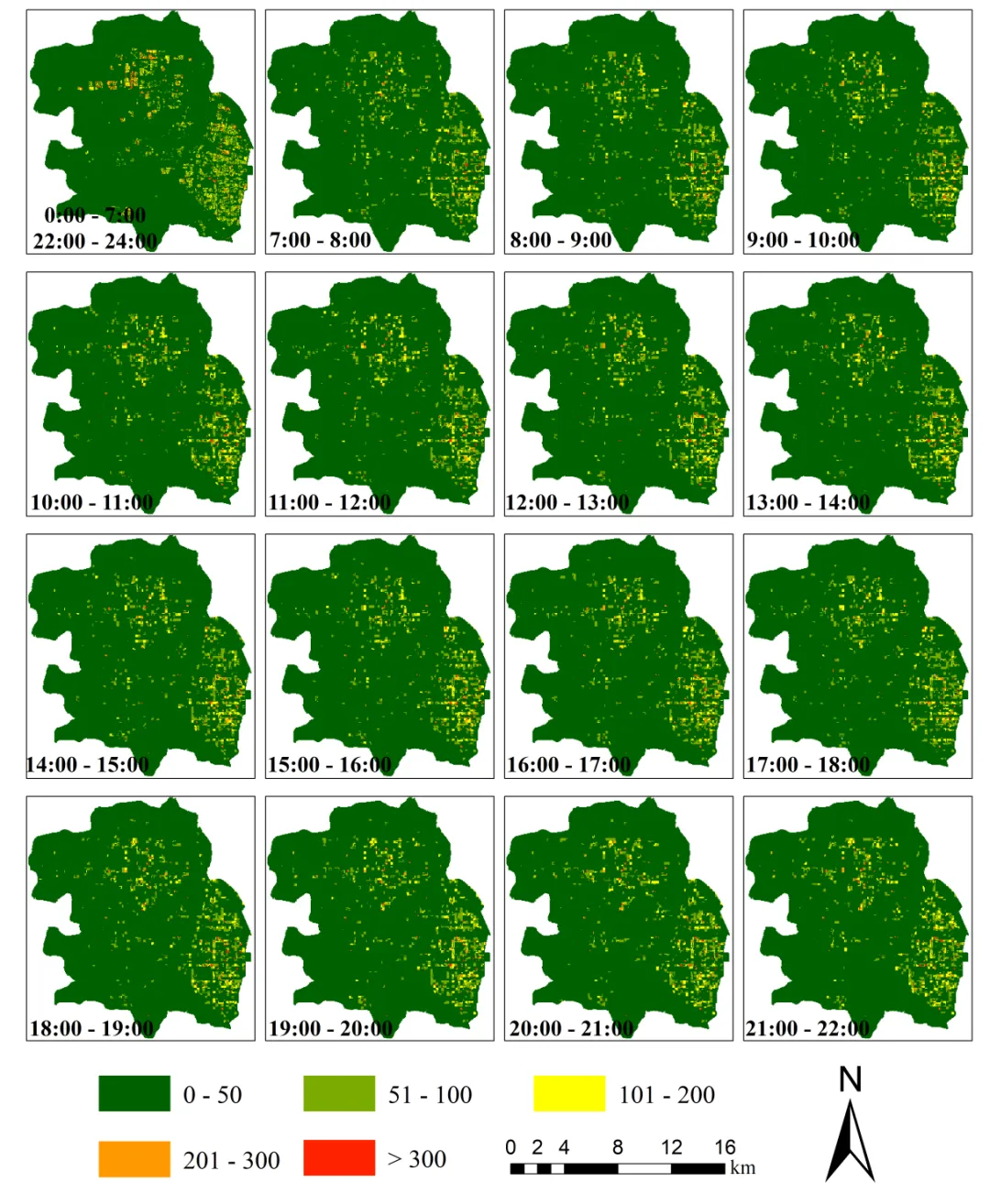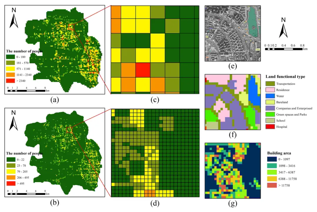 人口插值与偏差校正: 白天: 利用LBS数据(经总人口数校正后)反映MAG的相对密度,并结合通勤率(取1.16)调整白天流入的就业人口。对于NMAG(婴幼儿、幼儿园及小学生),则根据其人地活动规律(居家、在园、在校),使用差异化的面积权重法,将其分配至相应的住宅、幼儿园和小学土地类型上。夜间: 由于LBS数据失真,主要依据建筑楼层面积权重,将常住人口中的各类群体(如大学生分配至大学用地,其余分配至居住用地)以及住院病人等随机人口分配至对应功能建筑中。