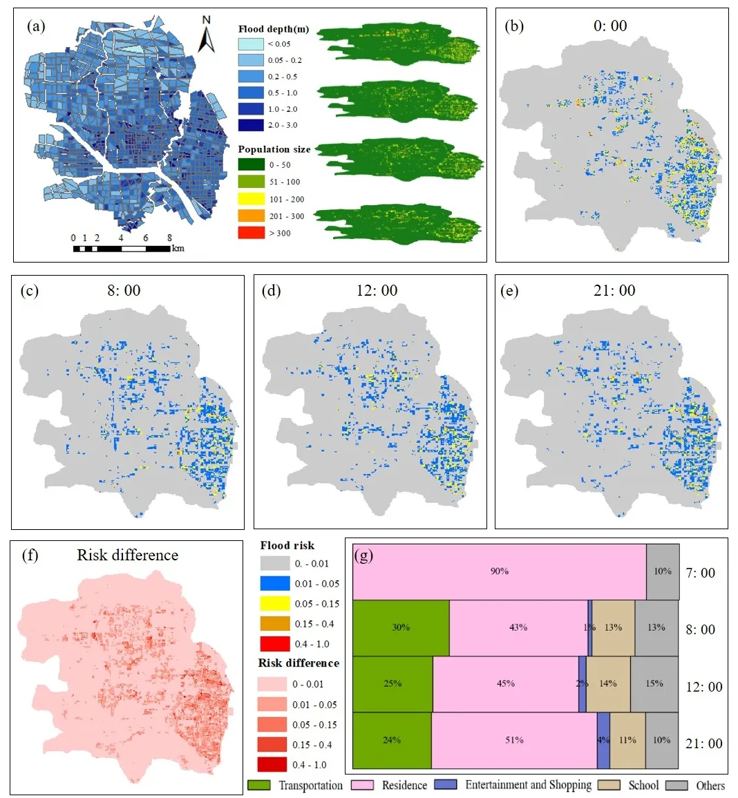 动态风险分析示例: 采用“动态暴露-危险性-脆弱性”风险框架(忽略脆弱性),将50年一遇洪水水深与四个典型时段(夜间、早高峰、午间、夜间活动期)的人口分布进行叠加分析,展示了洪水风险随人口流动而产生的时空变化规律。