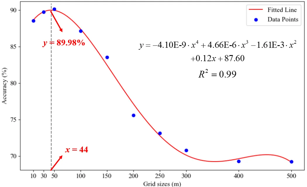 ULF识别最优方案与阈值效应: 在10个预设网格尺度中,50米尺度下的7类数据组合(D1-D7) 取得了最高的ULF识别精度,达到90.14%,比所有方案的平均精度(72.69%)高出17.45%。研究发现,网格尺度和数据量对识别精度均存在显著的“阈值效应”。网格尺度方面,识别精度随尺度减小而提高,但尺度小于44米后,因网格内噪声干扰加剧,精度反而可能下降。数据量方面,引入更多有效数据能提升精度,但当数据量增至8类时,因信息冗余和噪声干扰,最高精度反而从7类数据时的90.14%下降至88.36%。此外,不同尺度下所需的最优数据组合形式不同,表明数据需求具有尺度依赖性。