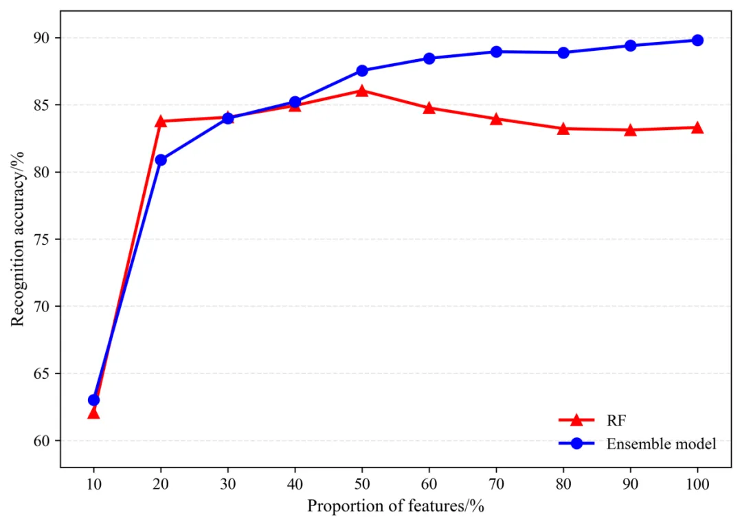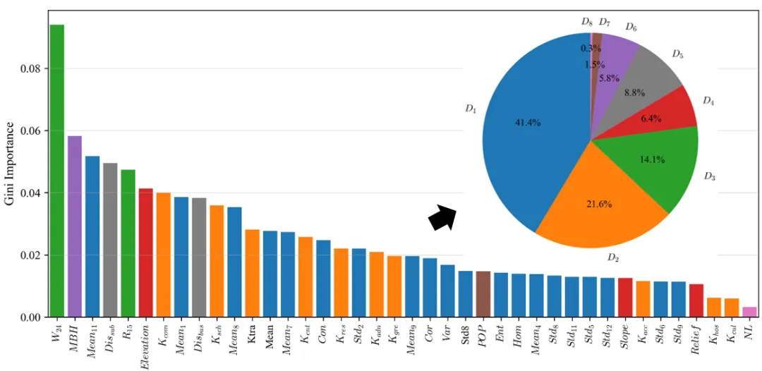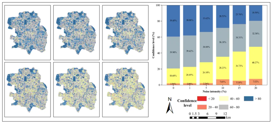 特征贡献与模型鲁棒性: 对最优方案的特征分析显示,工作日24:00的LBS核密度特征(W24)贡献度最高,其次是HRI和POI数据特征。通过特征筛选和组合优化可以在较低计算成本下获得满意精度,但集成模型通过融合多算法优势,能利用那些单独重要性低但具有互补效应的特征,从而追求最大精度。噪声测试表明,即使对重要特征施加±20%的随机噪声,模型对低置信度结果的预测比例仍极低,显示出较强的抗干扰能力和鲁棒性。