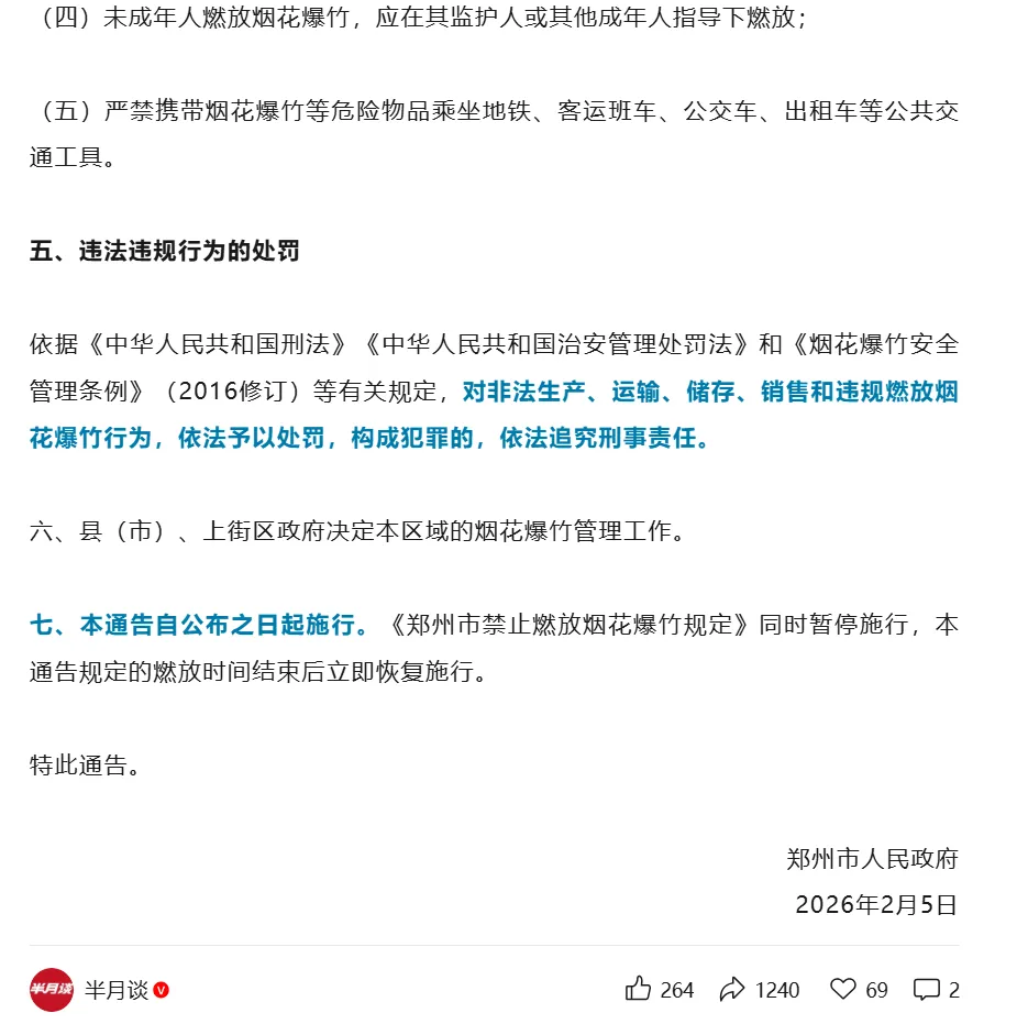2026年2月9日晚上八点,《半月谈》全文转发《郑州发布2026年春节烟花爆竹燃放规定》,文章中有郑州市市政府《郑州市人民政府关于加强2026年春节期间烟花爆竹禁放限放工作的通告》的截图。我愿称之为郑州市制定政策少有的高光时刻!