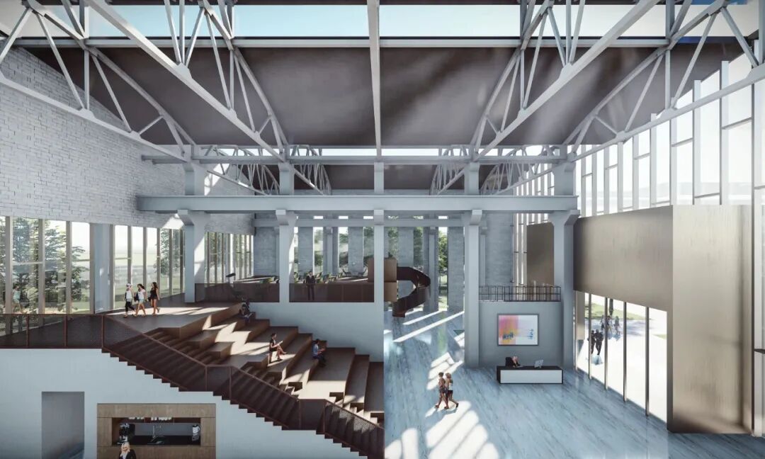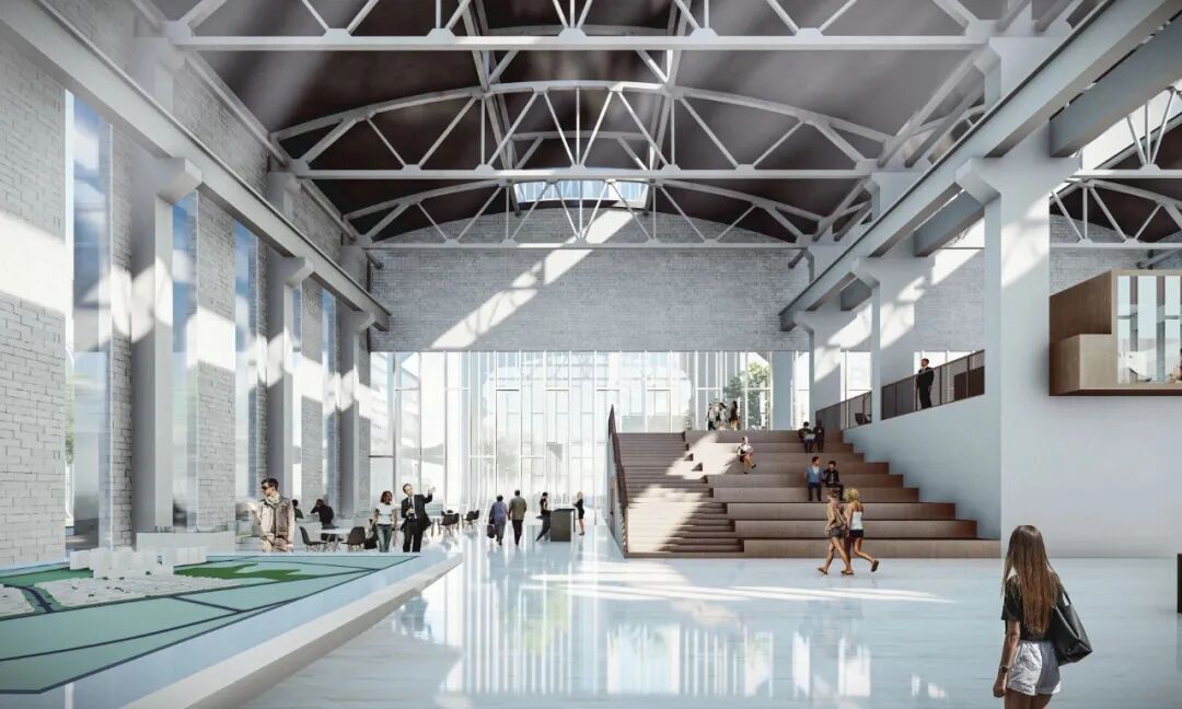 项目总建筑面积25万㎡,在规划上,高层建筑围合而成一个大广场,对市民开放,为教育业态的公共活动提供场所,切片式的立面组合让体量显得不那么巨大。在街角保留了一个老工厂的部分结构,并改造成工业风的展厅。在裙房商业部分营造多首层,高低错落的街区氛围,并成组团化,塑造出整体的特质。