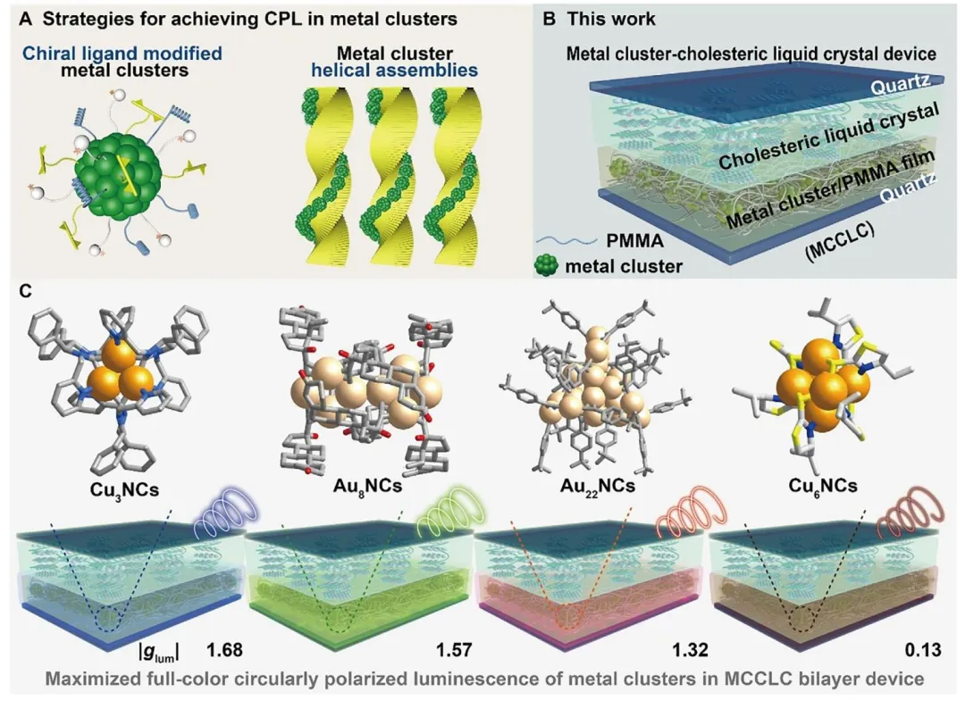 Scheme 1、A) 手性金属团簇和金属团簇掺杂螺旋超结构的策略示意图。这些策略存在CPL性能不理想和发射效率适中的问题,阻碍了其实际应用。B) 本研究中开发的MCCLC双层器件结构示意图。展示了明亮的发射和优异的CPL性能。C) MCCLC双层器件中金属团簇的结构示意图以及全色MCCLC双层器件的示意图。