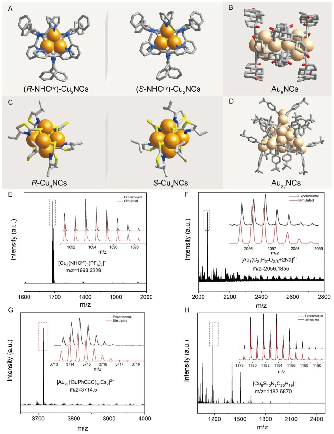Figure 1、A) 整体单晶结构的手性对映体R/S-NHC py-Cu<sub>3</sub>NCs,B) Au<sub>8</sub>NCs,C) Au<sub>22</sub>NCs,和 D) 手性对映体R/S-Cu<sub>6</sub>NCs。颜色代码:Cu,浅橙色;Au,棕褐色;C,灰色;O,红色;N,浅蓝色;S,黄色。E) S-NHC py-Cu<sub>3</sub>NCs,F) Au<sub>8</sub>NCs,G) Au<sub>22</sub>NCs,和 H) S-Cu<sub>6</sub>NCs的电喷雾电离质谱分析,以进一步确定样品的分子式。
