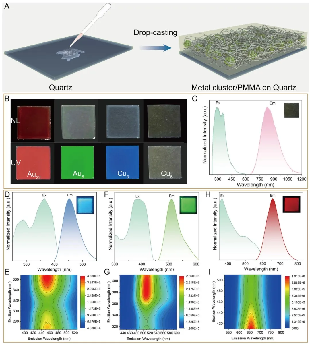 Figure 2、A) 金属团簇/PMMA复合薄膜的滴铸过程。B) 复合薄膜系统的照片(从左到右:Au<sub>22</sub>NCs/PMMA,Au<sub>8</sub>NCs/PMMA,(S-NHC py)-Cu<sub>3</sub>NCs/PMMA,和 S-Cu<sub>6</sub>NCs/PMMA)在自然光(NL)和紫外光下。C) S-Cu<sub>6</sub>NCs/PMMA薄膜的归一化激发和发射光谱。D) (S-NHC py)-Cu<sub>3</sub>NCs/PMMA薄膜的归一化激发和发射光谱,以及 E) 激发-发射矩阵光谱。F) Au<sub>8</sub>NCs/PMMA薄膜的归一化激发和发射光谱,以及 G) 激发-发射矩阵光谱。H) Au<sub>22</sub>NCs/PMMA薄膜的归一化激发和发射光谱,以及 I) 激发-发射矩阵光谱。