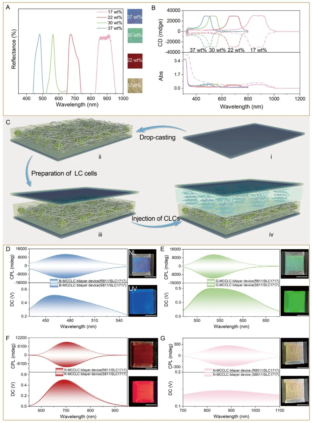 Figure 3、A) 不同重量比下S811/SLC1717的反射光谱。插图:自然光下的相应照片。B) 不同重量比下CLCs的强镜像圆二色信号。C) MCCLC双层器件的制备示意图。D) B-MCCLC,E) G-MCCLC,F) R-MCCLC,和 G) N-MCCLC双层器件的CPL光谱。插图:自然光和紫外光下的相应器件照片。比例尺:1厘米。