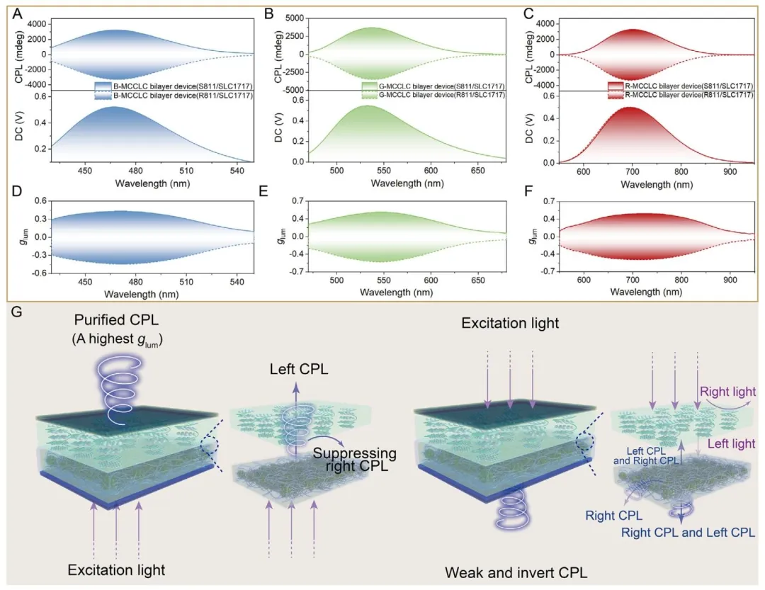 Figure 4、A) B-MCCLC,B) G-MCCLC,和 C) R-MCCLC的CPL光谱。注意:发光复合薄膜面向探测器。D) B-MCCLC,E) G-MCCLC,和 F) R-MCCLC的g<sub>lum</sub>曲线。注意:发光复合薄膜面向探测器。G) 双层器件中CLCs层和发光复合薄膜分别面向激发光的光路示意图。