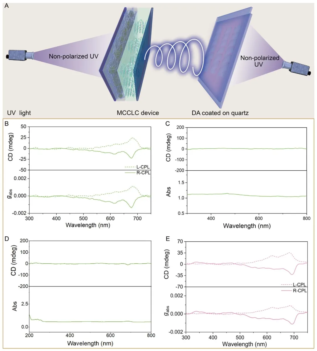 Figure 5、A) 对映选择性光聚合的实验装置示意图。以B-MCCLC为例。B) 使用G-MCCLC发出的L-CPL或R-CPL与非偏振紫外光共同获取的PDA薄膜的圆二色光谱。C) 仅在CPL照射下聚合的PDA薄膜的圆二色光谱。D) 仅在非偏振紫外光下聚合的PDA薄膜的圆二色光谱。E) 使用N-MCCLC发出的L-CPL或R-CPL与非偏振紫外光共同获取的PDA薄膜的圆二色光谱。
