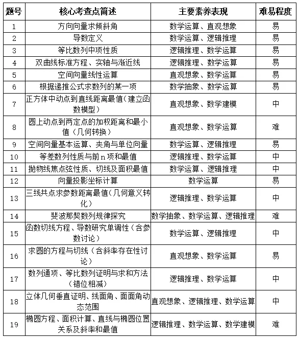 数学基本思想方法是试卷区分学生思维水平的关键,在诸多问题中得到了深度渗透。例如第13、16、19题(解析几何背景),第15题(借助导数符号分析函数单调性)考查了数形结合思想;第15题(2)(含参函数单调性的讨论),第16题(2)(过圆外一点求切线,需讨论斜率是否存在)考查了分类讨论思想;第17题(2)(将复杂递推关系转化为等比数列);第14题(1)(将数列求和问题转化为余数数列周期性问题);第18题(1)(将线面垂直转化为线线垂直)考查了转化与化归思想。