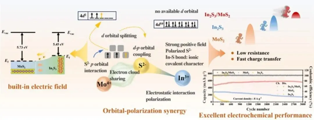 在这项研究中,研究人员采用溶剂热法成功制备了In₂S₃/MoS₂异质结构,并系统研究了其作为钠离子电池负极材料的电化学性能及储能机理。该研究的核心创新在于揭示了异质界面处d-p轨道耦合与离子极化的协同作用机制。具体而言,在In₂S₃与MoS₂的接触界面,Mo⁴⁺的空d轨道接受来自S²⁻的p轨道电子捐赠,形成电子云共享和共价键特征;同时,高价态的In³⁺对S²⁻电子云产生强烈的极化作用,增强了离子键特性。这两种效应的协同作用不仅稳定了异质界面结构,还引发了电荷重新分布,形成了从MoS₂指向In₂S₃的内建电场。该电场有效加速了电子转移和钠离子迁移过程。通过原位和非原位表征手段,研究人员详细阐明了该材料的多步储钠机制,包括嵌入反应、转化反应和合金化反应,并证实了其优越的反应动力学特征。电化学测试结果表明,In₂S₃/MoS₂电极在8 A g⁻¹的高电流密度下循环3000次后仍保持551.3 mA h g⁻¹的高比容量,在10 A g⁻¹的超高倍率下仍能提供433.9 mA h g⁻¹的容量。值得注意的是,该材料无需依赖外部导电包覆即可实现本征高电化学性能,简化了材料制备工艺。