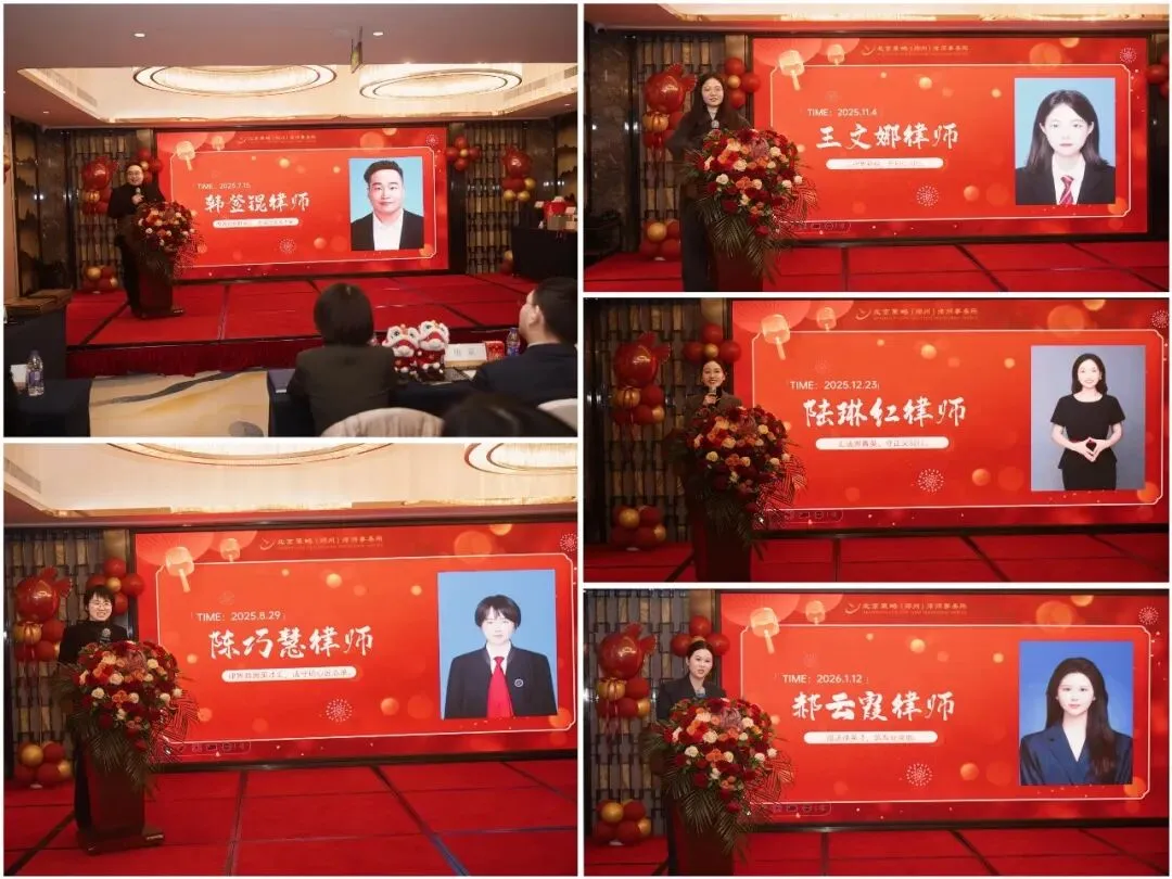 “近悦远来” 的发展理念,在新鲜血液的注入中得到生动诠释。年会现场,韩登锟、陈巧慧、王文娜、陆琳红、郝云霞五位新进律师登台亮相,分享加盟初心与职业期许。