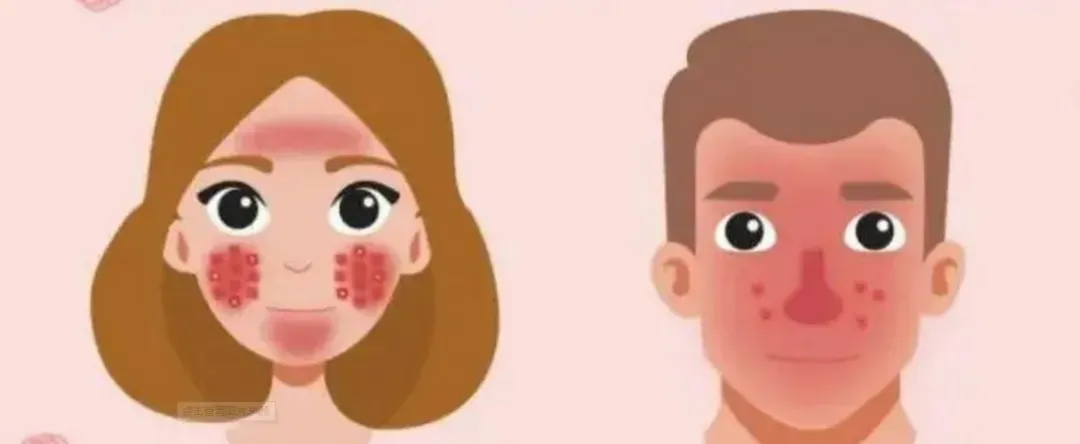 红斑期症状:鼻、两颊、眉间及颏部出现红斑对称分布。