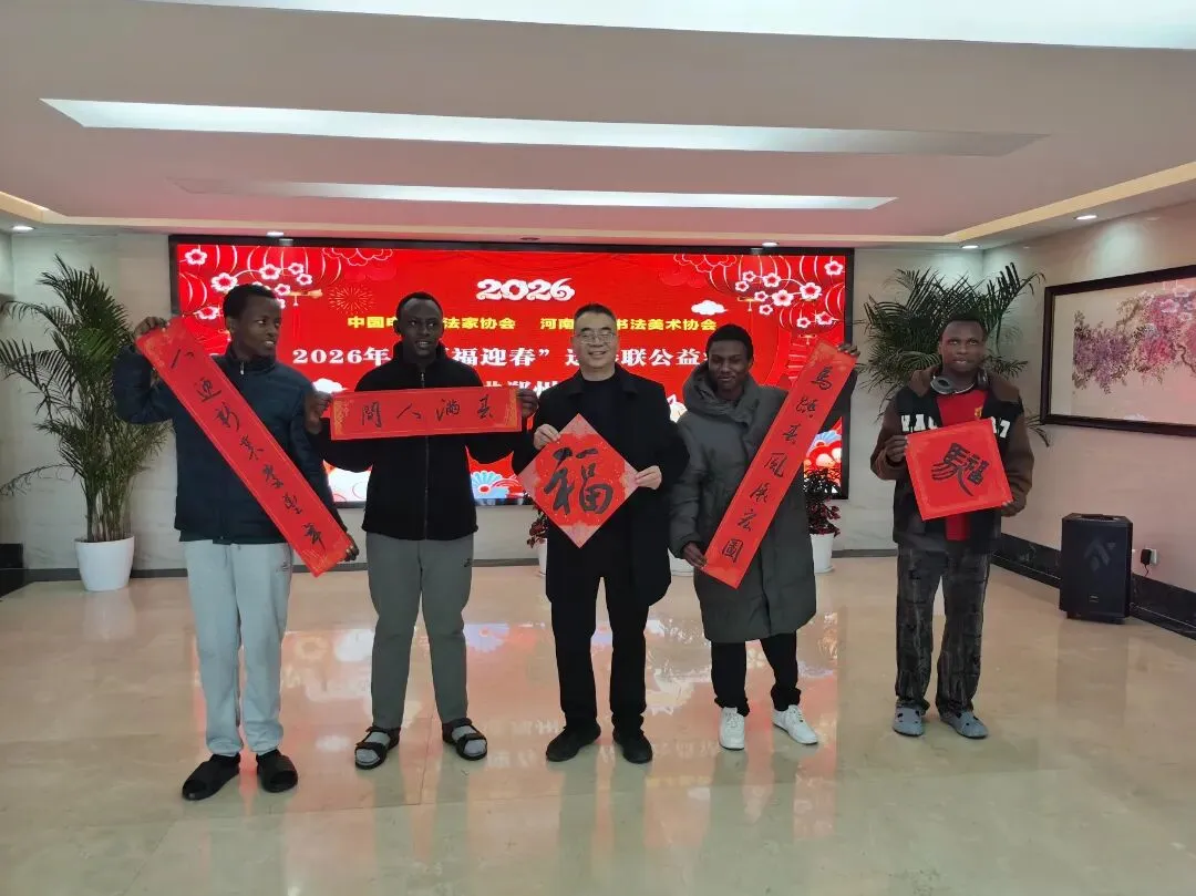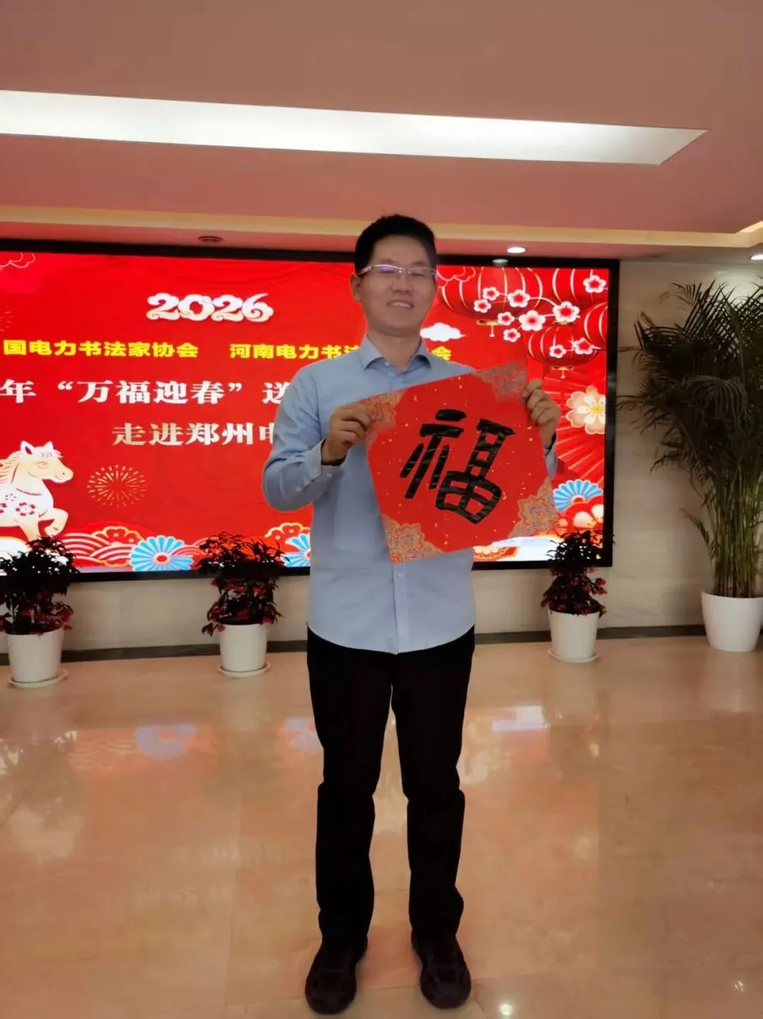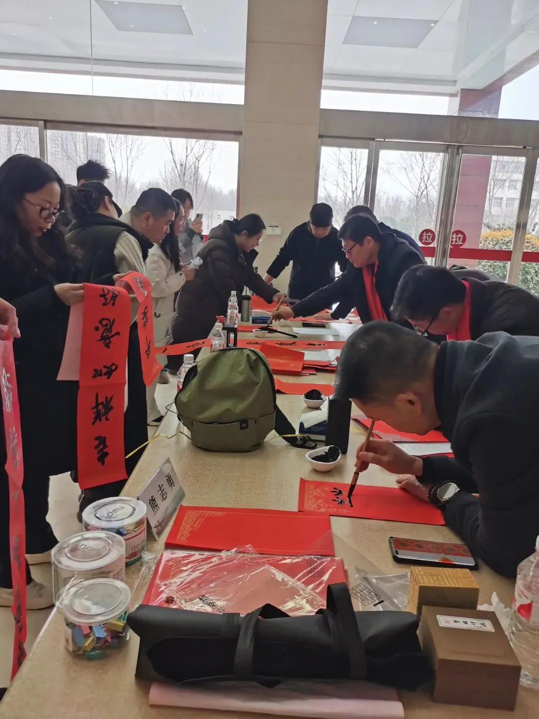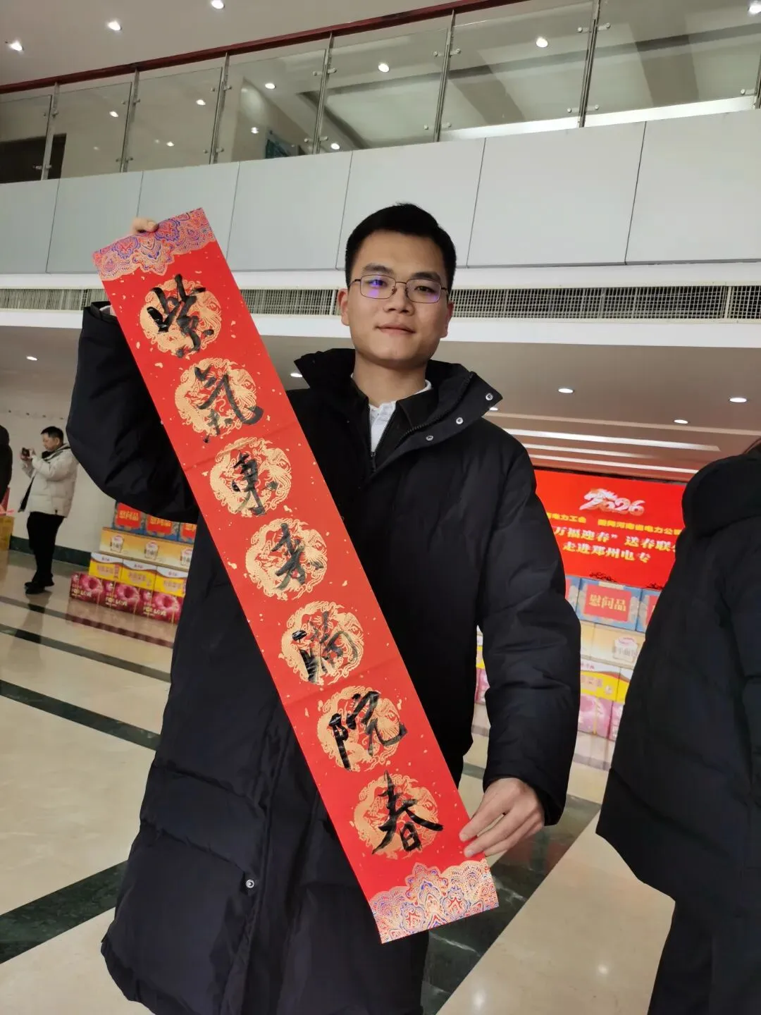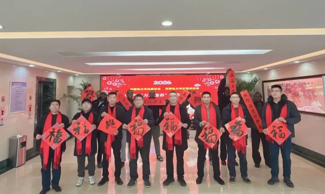 在新春佳节来临之际,为营造喜庆祥和的节日氛围,2月9日,学校工会联合河南省电力书法美术协会邀请中国书法家协会、中国电力书法家协会、河南省书法家协会的8位书法家,在办公楼一楼大厅开展了“万福迎春”2026年写春联送祝福活动。活动吸引了200余名教职工热情参与,17名留校的卢旺达留学生深度体验,在红纸墨香中共同预热了中国年。