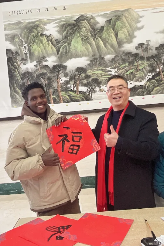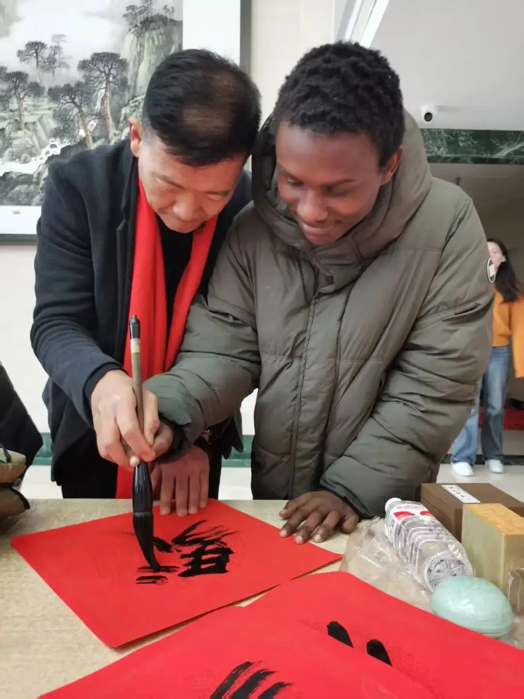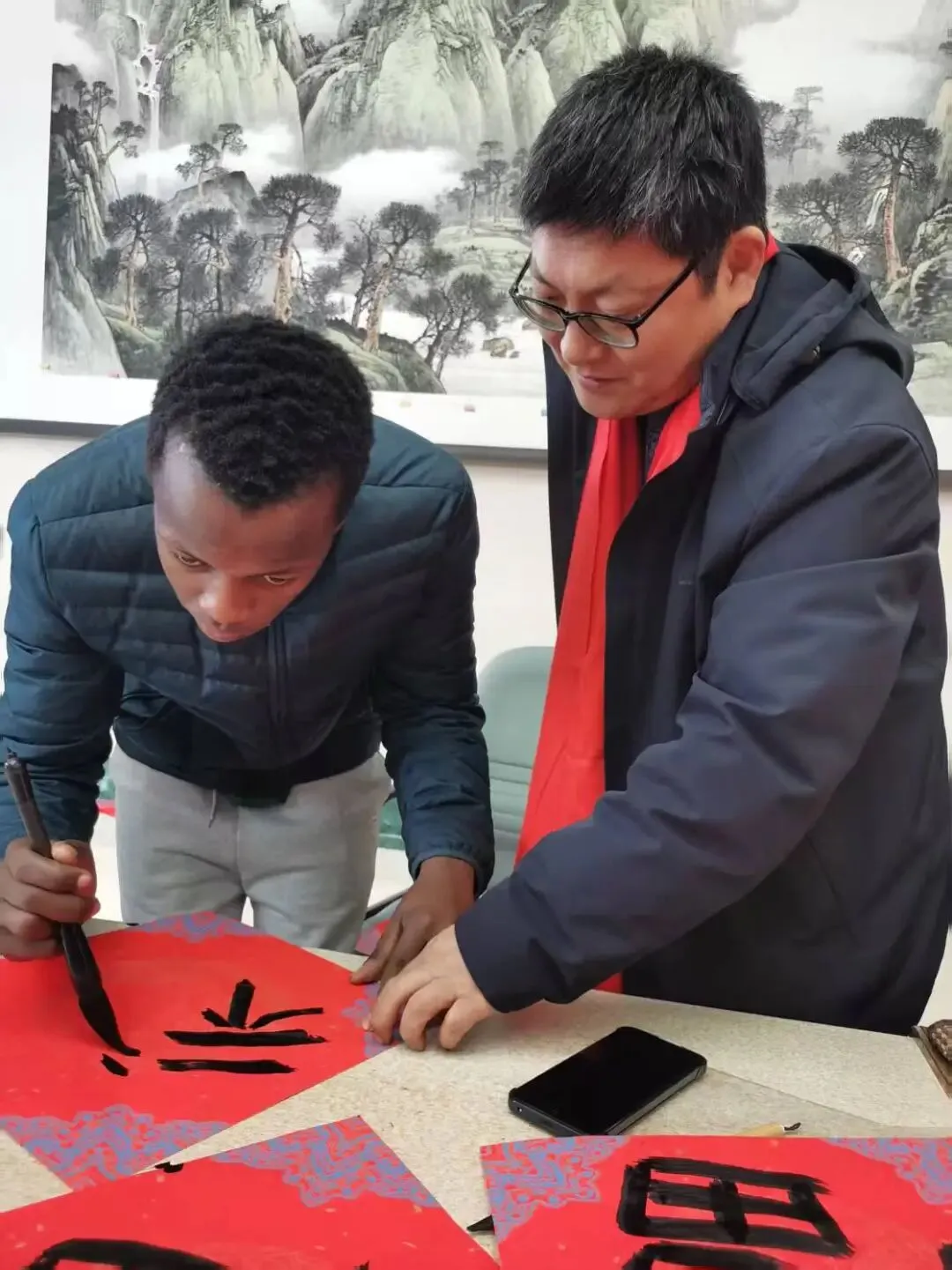 来自卢旺达的留学生们对笔墨、春联表现出浓厚兴趣。书法家们耐心讲解春联所承载的辞旧迎新、祈福纳祥的文化内涵,还手把手地指导他们执笔、运腕,书写简单的“福”字。留学生们认真临摹,虽然笔触尚显稚嫩,但每一笔都充满了对中国传统文化的好奇与尊重。