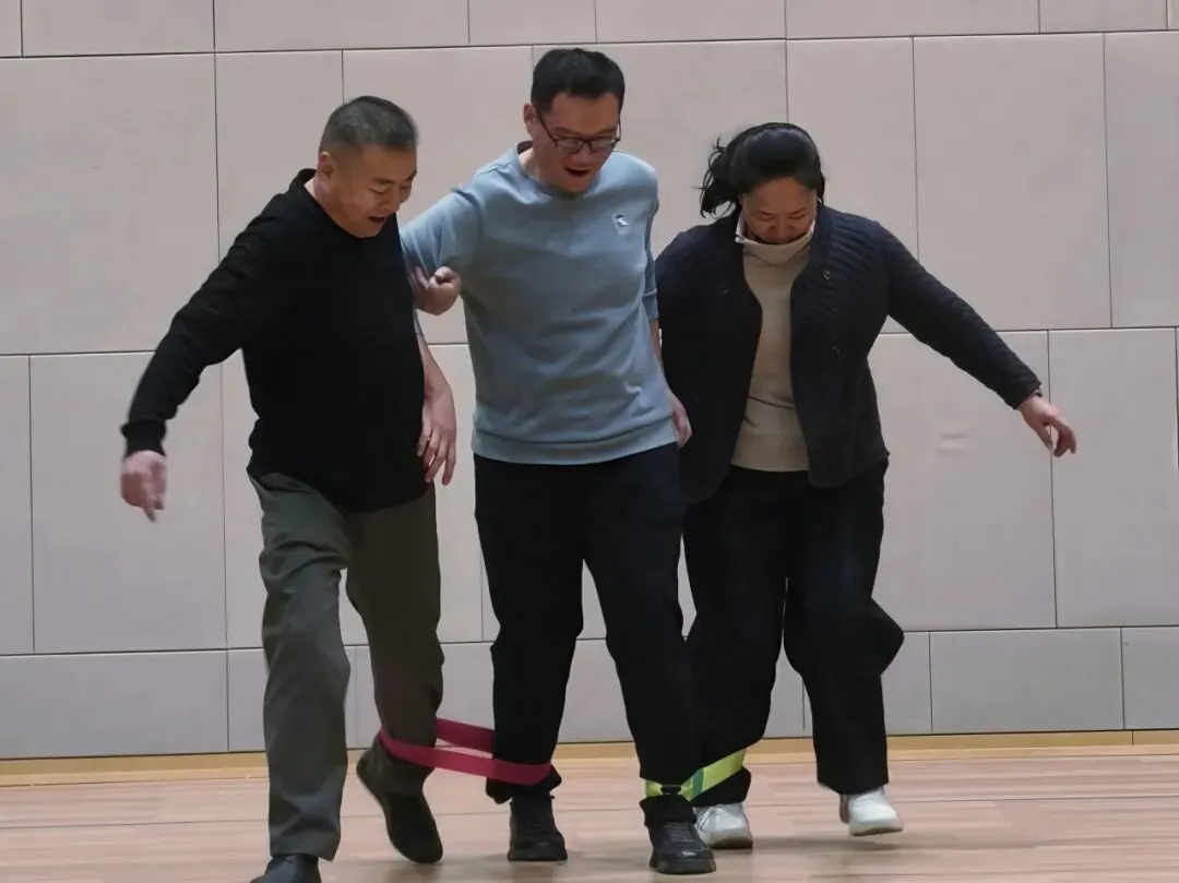 团体协作组,同心聚力凝共识,携手同行话团圆。团体跳绳、三人四足两项比赛,将现场氛围一次次推向高潮。团体跳绳赛场,摇绳队员默契配合、节奏统一,跳绳队员们身姿轻盈、依次跳跃,大家齐声喊着整齐的口号,动作协调、步伐一致,即便偶尔出现失误,也能迅速调整状态、重新投入,用协作诠释“心往一处想、劲往一处使”的团队精神;三人四足比赛中,参赛队员两两绑腿、相互搀扶,喊着“一二一”的口号同步迈步,有的步伐稳健、配合默契,稳步冲向终点,有的虽偶有踉跄,却彼此鼓劲、绝不放弃,赛道上的奔跑与欢笑、坚持与互助,将“团圆协作”的活动主题展现得淋漓尽致,也让广大干部职工在互动中拉近了距离、增进了感情、凝聚了合力。
