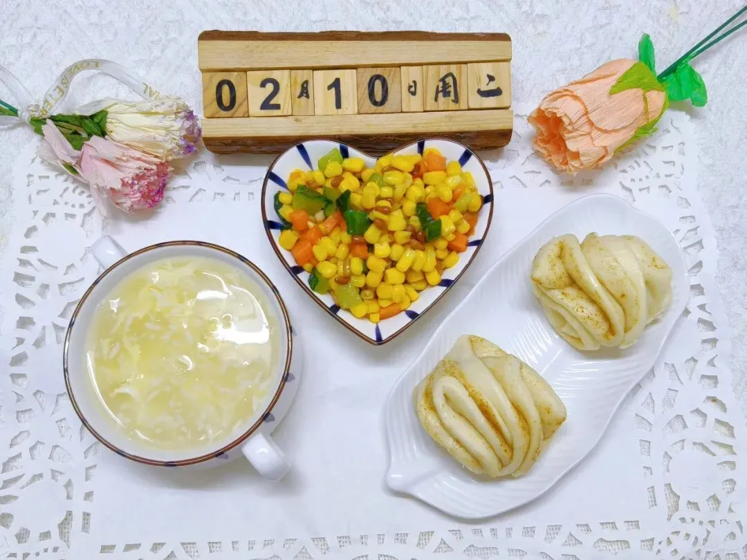 松仁玉米、椒盐卷、米酒鸡蛋羹