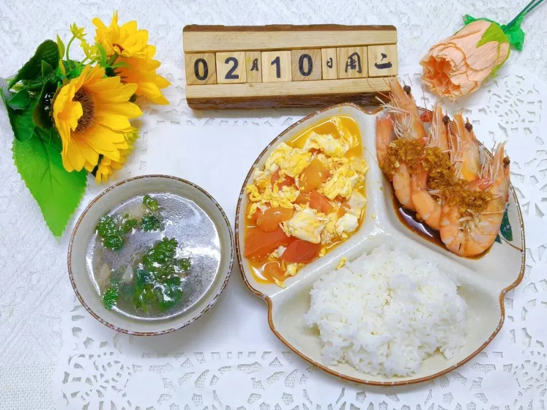 姜汁大虾、西红柿炒鸡蛋、三鲜菌菇汤