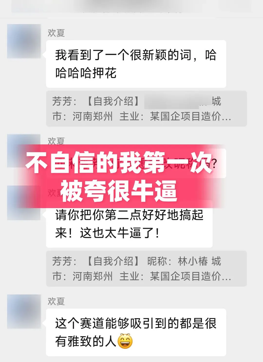 ”开营前欢夏教我们写自我介绍,我绞尽脑汁把自己几年的辉煌点都写了出来,本以为自己没什么特别的,在欢夏的影响下我逐渐发现自己的独特闪光点,原来我也是这么厉害也能被崇拜的欢夏夸一句牛逼原来我也能这么棒,我也能做的很好了!真的很感谢欢夏和姐妹们一直给的鼓励!