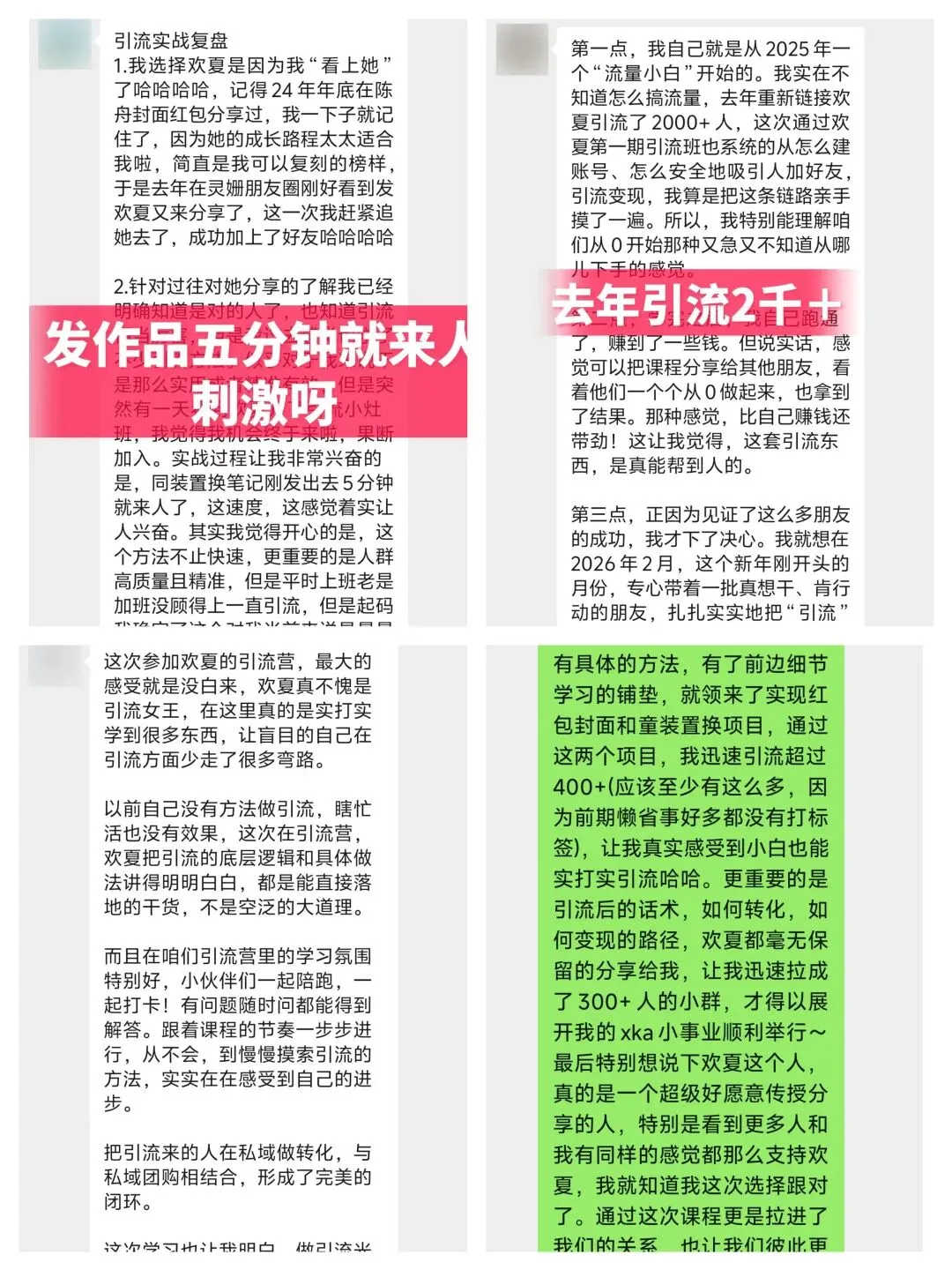 当惊喜过后,我冷静地回想了这快一个月课程的经历,对我来说课程刚出的时候我正在纠结年后如何快速开展副业,想要让自己迅速成长有一个稳定的收入,看到欢夏课程我像抓着稻草一样,希望自己跟着欢夏能有所收货,因为我是一直很相信欢夏的,基本上是我在互联网上看着他一步一步厉害起来,成为如今的“流量女王”,一年引流1万+真的很牛了,也希望能跟欢夏让自己的命运齿轮开始转动。