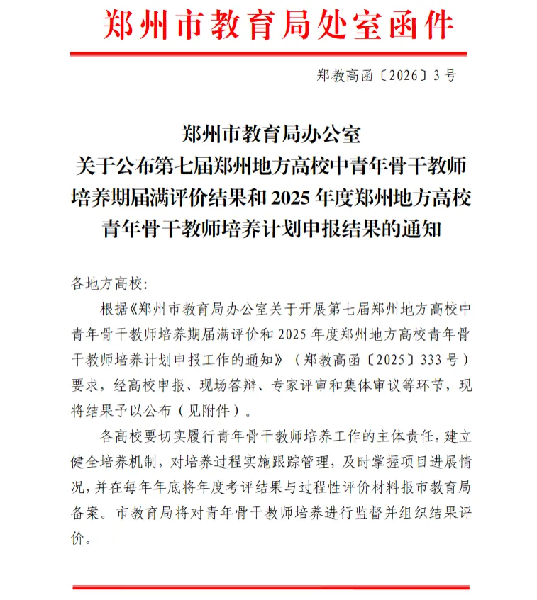 近日,郑州市教育局印发《关于公布第七届郑州地方高校中青年骨干教师培养期届满评价结果和2025年度郑州地方高校青年骨干教师培养计划申报结果的通知》(郑教高函〔2026〕3号),我校赵瑶、王清莉两位教师成功入选2025年度郑州地方高校青年骨干教师培养计划。