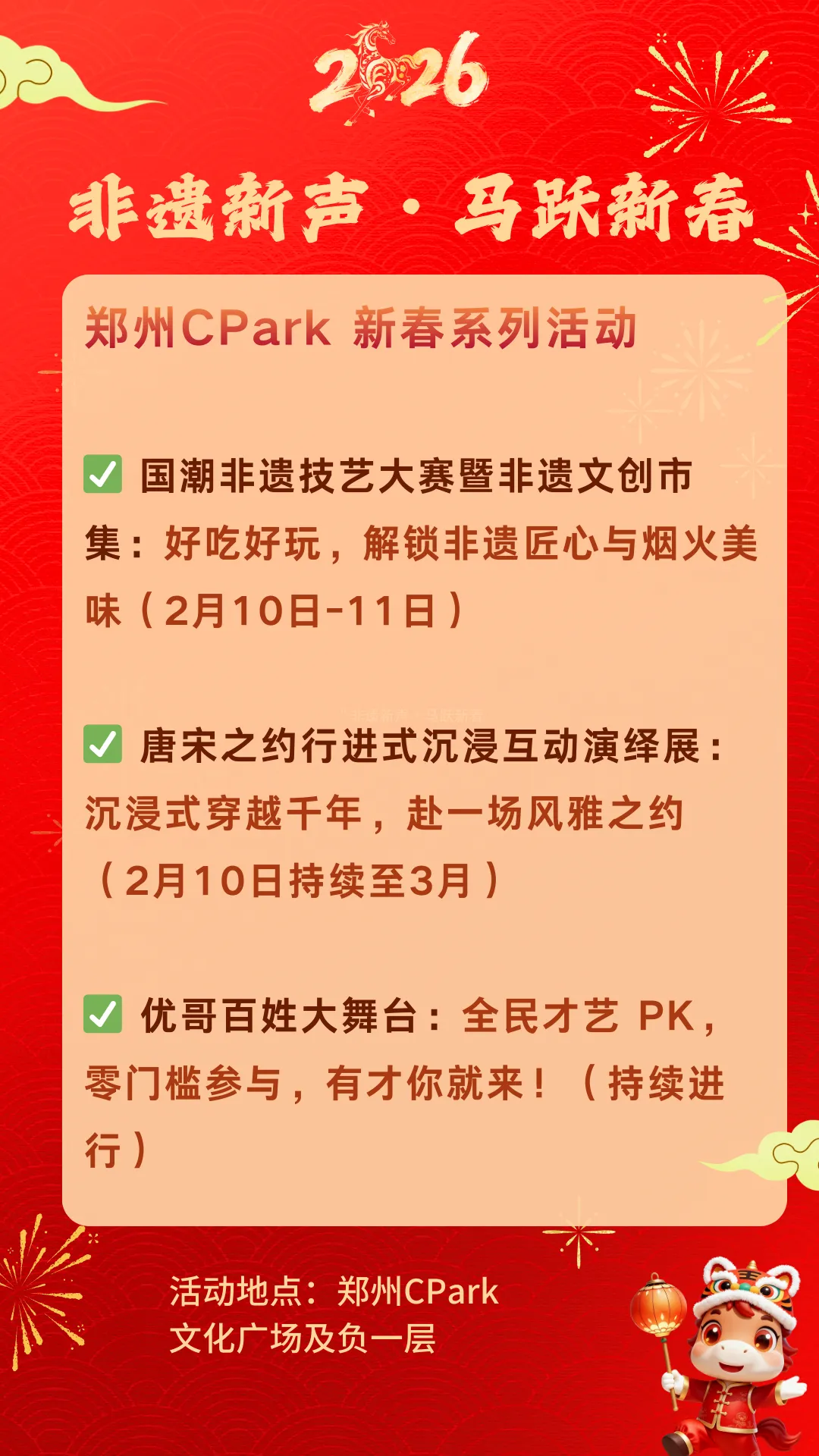 作为郑州 1.75 公里文化 + 体验 + 商业综合体,郑州 CPark 重磅推出 “非遗新声・马跃新春” 系列活动,集非遗盛宴、沉浸演绎、才艺比拼、亲子游乐、美食小吃于一体。从小年开始,带你解锁最有仪式感的新春玩法,每一处都藏着惊喜,这份超全游玩攻略,赶紧码住!