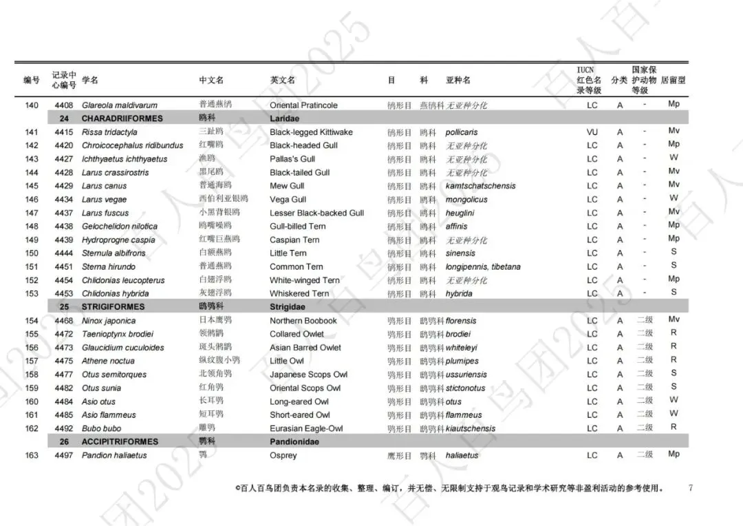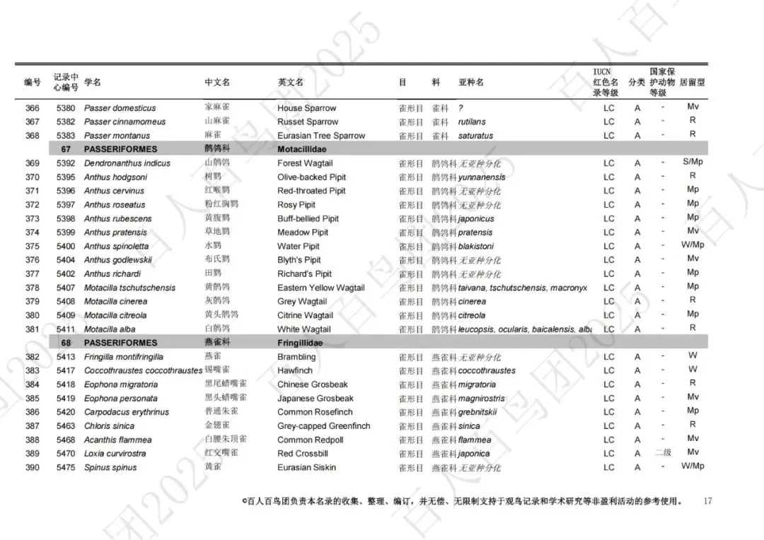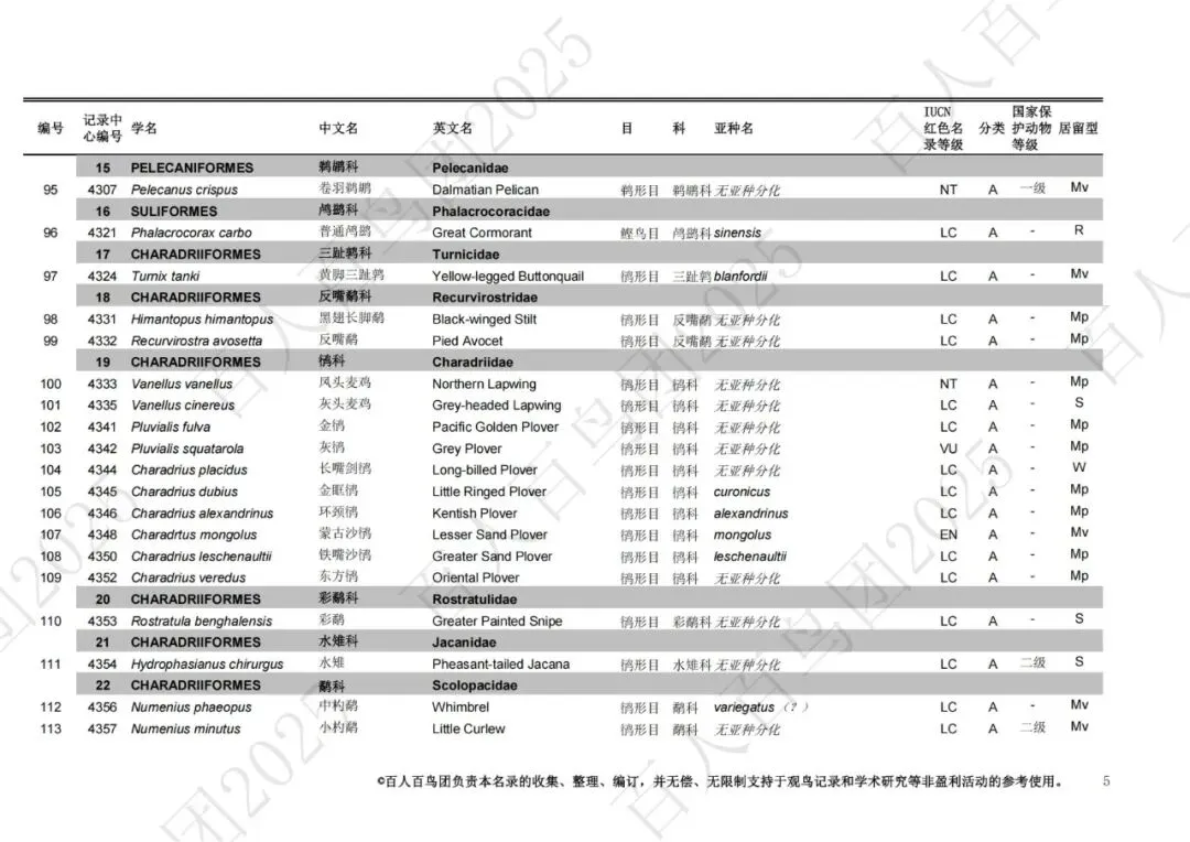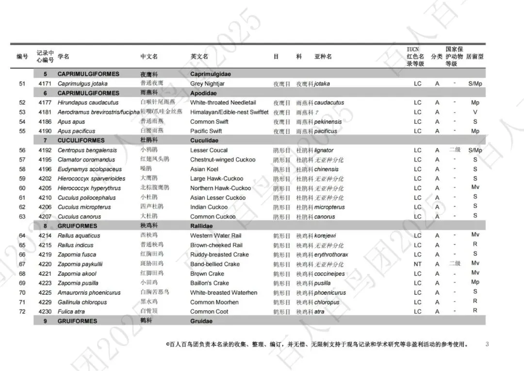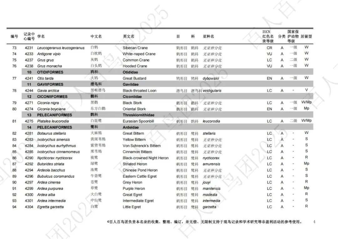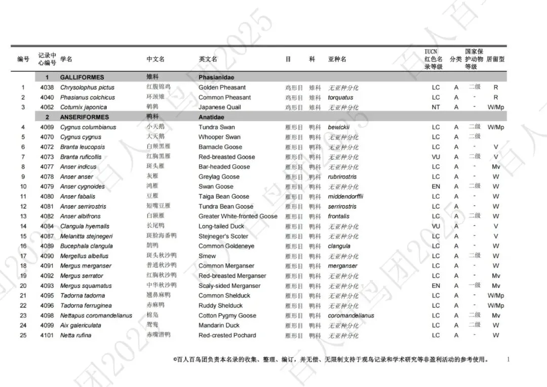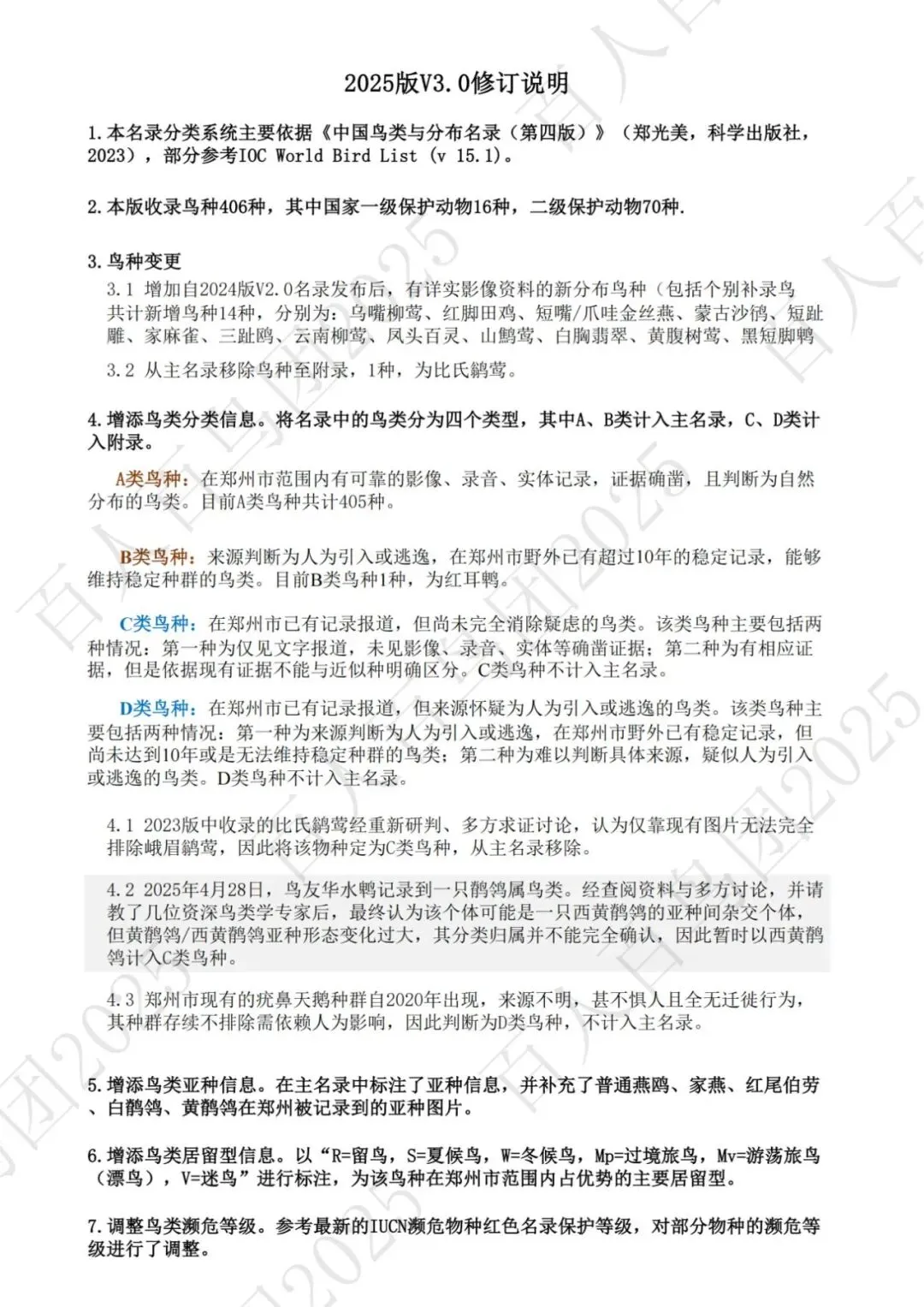 为进一步梳理鸟类分布的基本信息,促进观鸟爱好者之间的交流,使公众对郑州鸟类有更为全面的认识,并为本地区鸟类的科学研究、资源保护提供一定的科学依据和资料参考,百人百鸟团对郑州鸟类名录再次开展修订工作,此次发布的《郑州市鸟类名录2025版》(V3.0)使用的分类系统、学名(拉丁名)、中文名、英文名均主要参考《中国鸟类分类与分布名录》(第四版),部分参考IOC World Bird List (v 15.1)。
