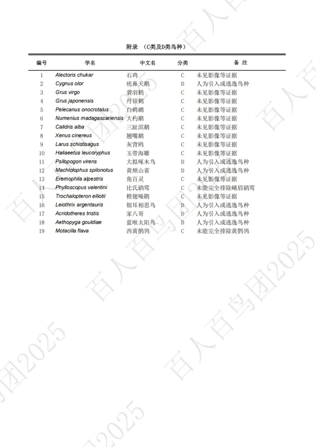 D类鸟种:在郑州市已有记录报道,但来源怀疑为人为引入或逃逸的鸟类。该类鸟种主要包括两种情况:第一种为来源判断为人为引入或逃逸,在郑州市野外已有稳定记录,但尚未达到10年或是无法维持稳定种群的鸟类;第二种为难以判断具体来源,疑似人为引入或逃逸的鸟类。D类鸟种不计入主名录。