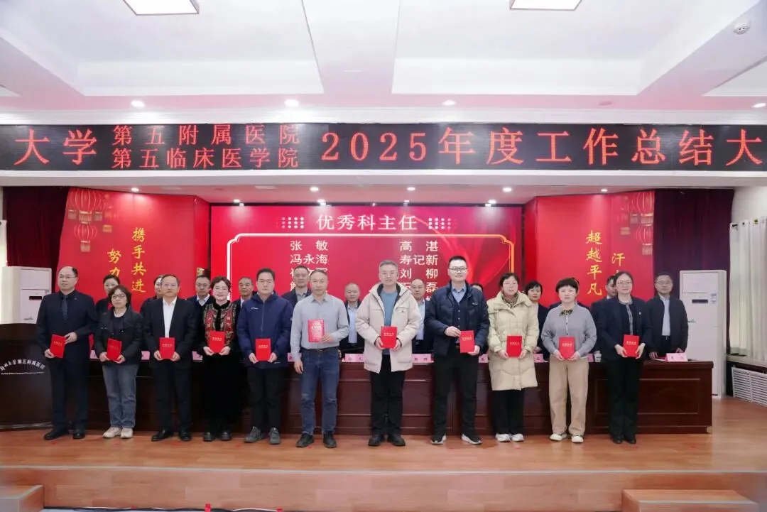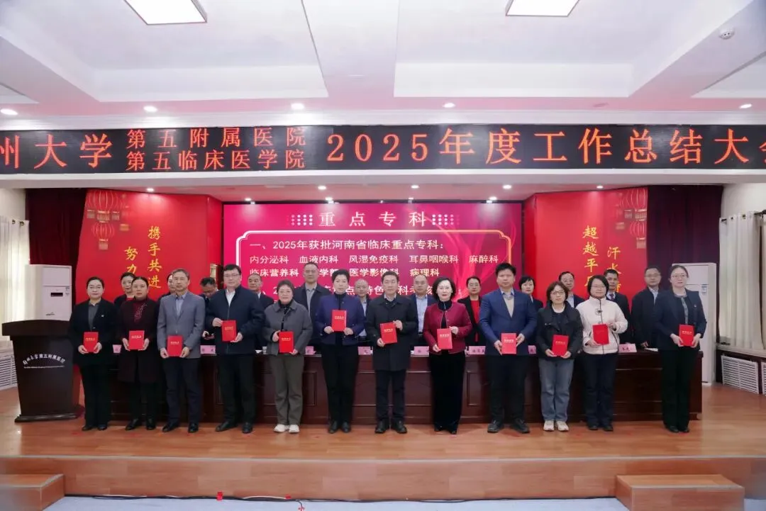 2026年2月10日下午,郑州大学第五附属医院、第五临床医学院召开2025年度工作总结大会,激励全院教职工再接再厉、乘势而上,全力推进高质量发展。院领导任义、韩晔、张伟宏、徐翠英、杨怀玉、王爱华、张庆、李哲、王琰、王建敏、梁欣凤、王润出席。各党支部书记、科主任、护士长及职工代表参加会议。会议由第五临床医学院执行院长张伟宏主持。