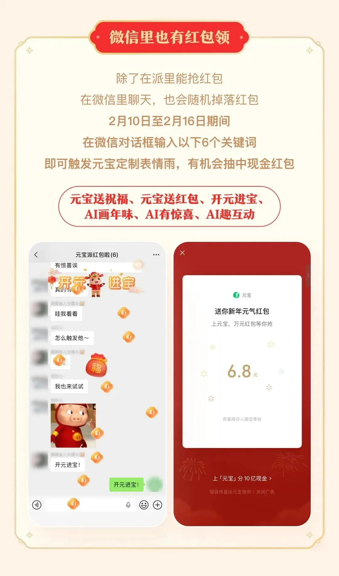 2月10日,元宝发文提醒,微信聊天发送“元宝”有福袋掉落,可随机获现金红包并直接存入微信零钱;同日元宝还回应,2月10日至16日,在微信对话框输入6个指定关键词,能触发定制表情雨,也有机会抽中现金红包。