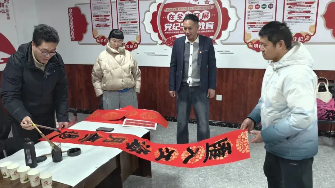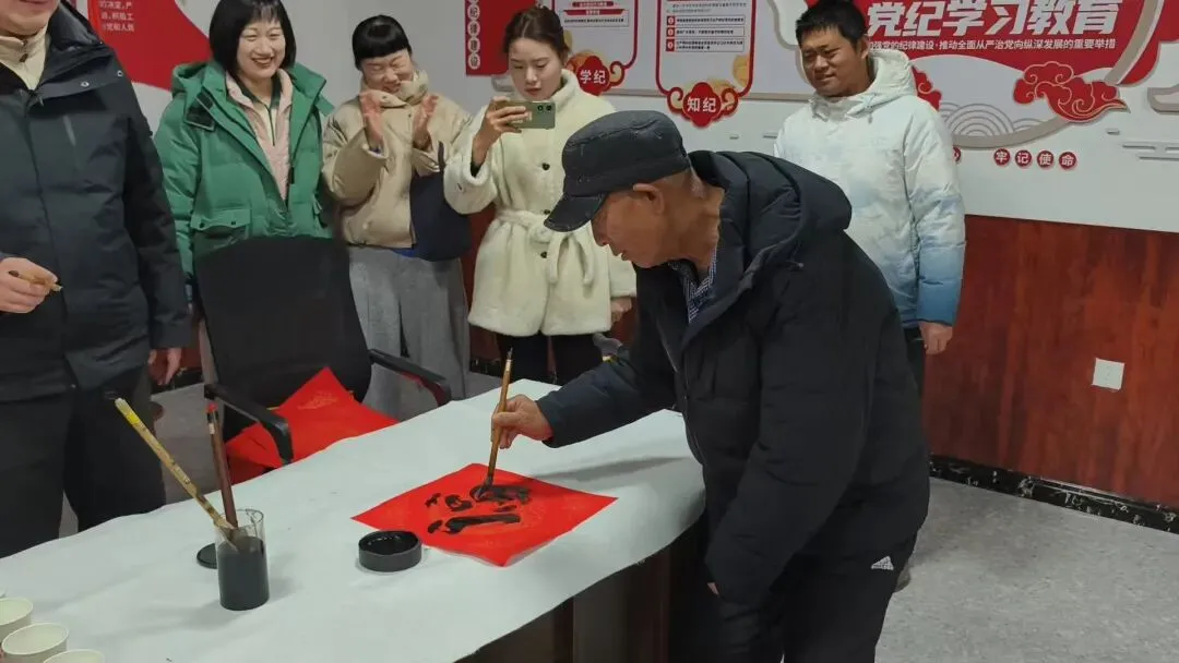 另一边,贾老师挥毫泼墨、笔走龙蛇,一幅幅饱含祝福的春联、一个个喜庆吉祥的“福”字跃然纸上,字迹工整有力,寓意美好绵长。