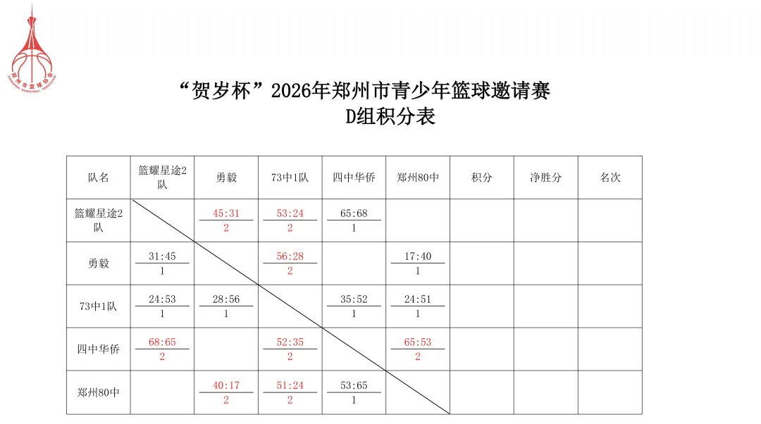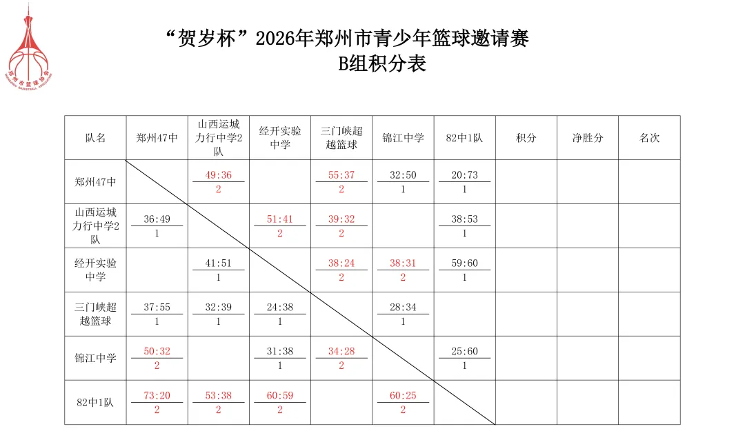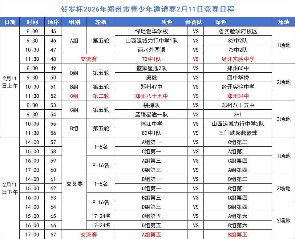 明日将继续进行“贺岁杯”2026年郑州市青少年篮球邀请赛小组赛、交叉赛的精彩对战,相信比赛会更加激烈精彩,广大球迷朋友可前往郑州师范学院综合训练馆进行现场观战,也可通过关注“郑州市篮球协会”官方公众号,了解比赛详情。