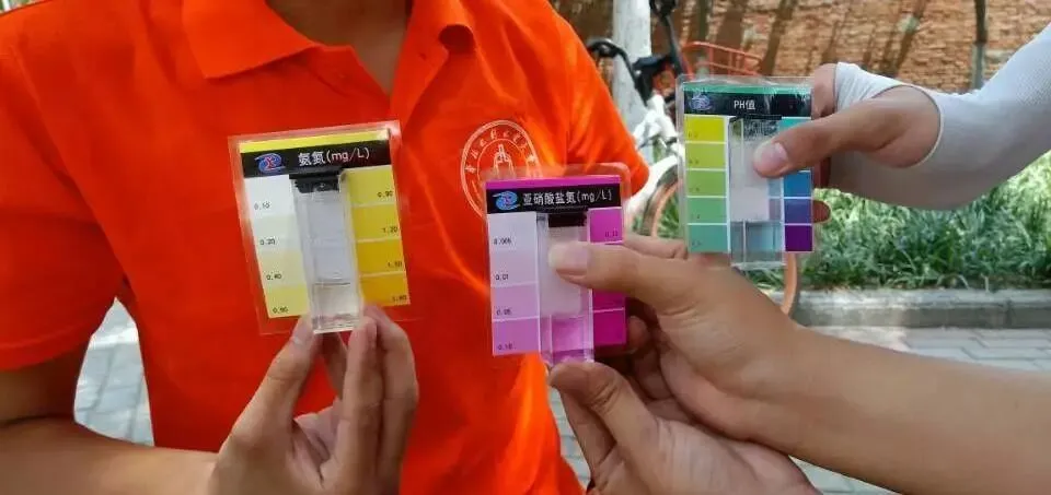 经过前三天郑州如意湖,象湖,滨河湿地公园节水护水宣传后,我们对熊耳河宣传斗志满满。一大早,我们实践队骑着共享单车来到了熊耳河,快到熊耳河时,我们远远看到熊耳河周边绿植丰富,环境优美,想来是一处休闲玩耍的好地方。但当我们走进时,一股淡淡的腥臭味打破了我们的幻想。我们匆忙放好自行车,取河水进行检测。检测发现氨氮,亚硝酸盐氮含量偏高,PH值显碱性。